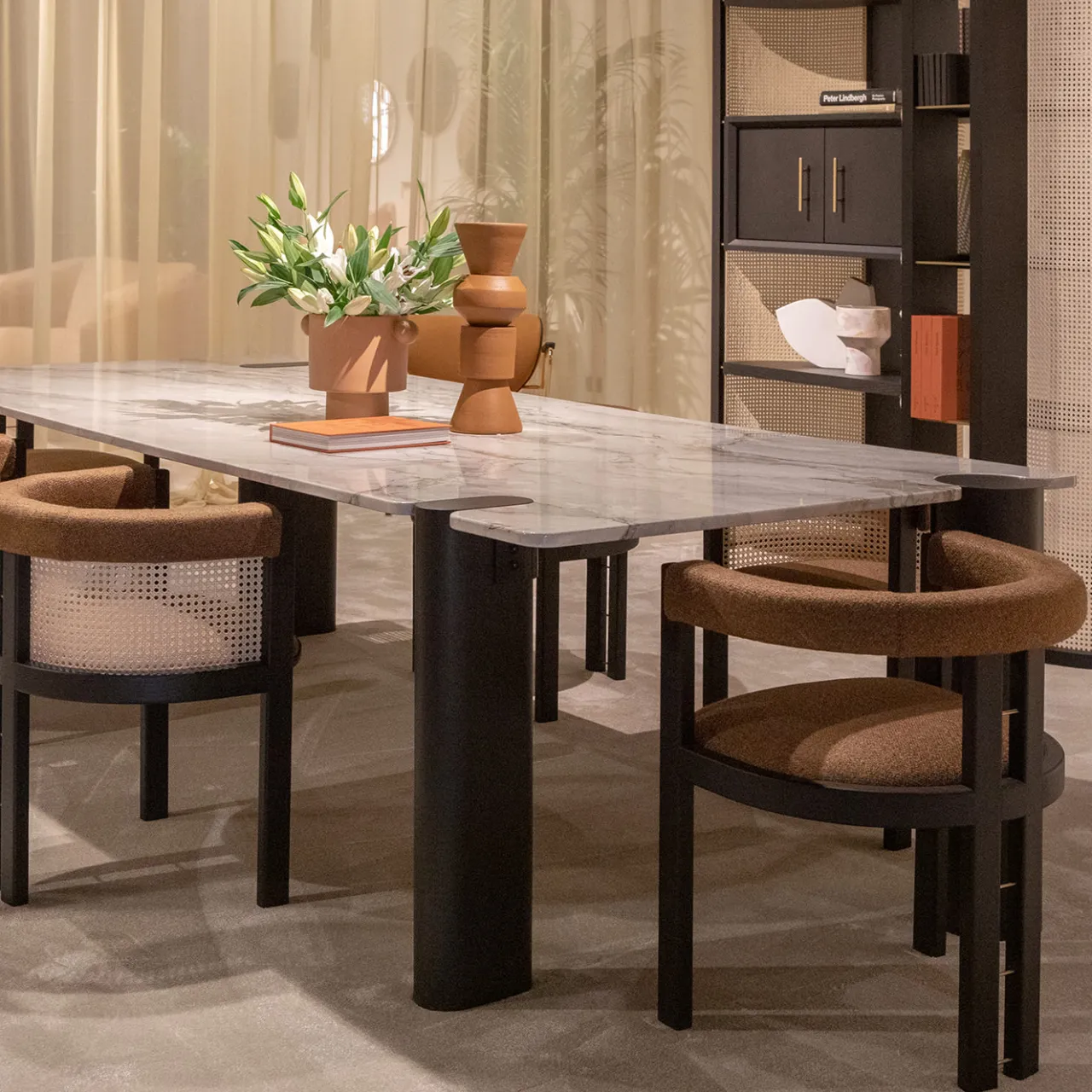 Un trono moderno e compatto dove sedersi per gustare una cena con gli amici, questa sedia vanta una struttura solida e ricca di curve avvolgenti sapientemente controbilanciate da profili affusolati. Le aste in ottone arricchiscono la struttura in massello di frassino tinto moka, completata da cuscini di seduta e di schienale imbottiti in poliuretano espanso e sigillati da una raffinata tappezzeria non sfoderabile per una dichiarazione di eleganza sartoriale.