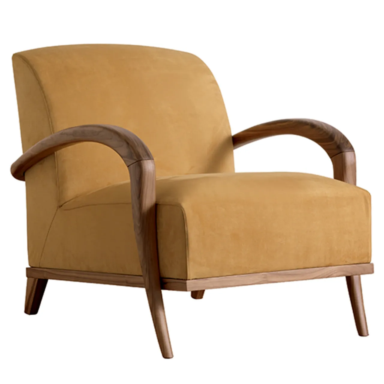 Linee morbide e armoniose e volumi generosi si fondono nella poltrona lounge Domino. Con una struttura in noce canaletto e gambe rinforzate da aste metalliche nascoste, la poltrona offre un comfort robusto. La sedia viene poi generosamente imbottita e rivestita con un materiale a scelta. Qui presentata in ecopelle gialla e noce tinto avana.