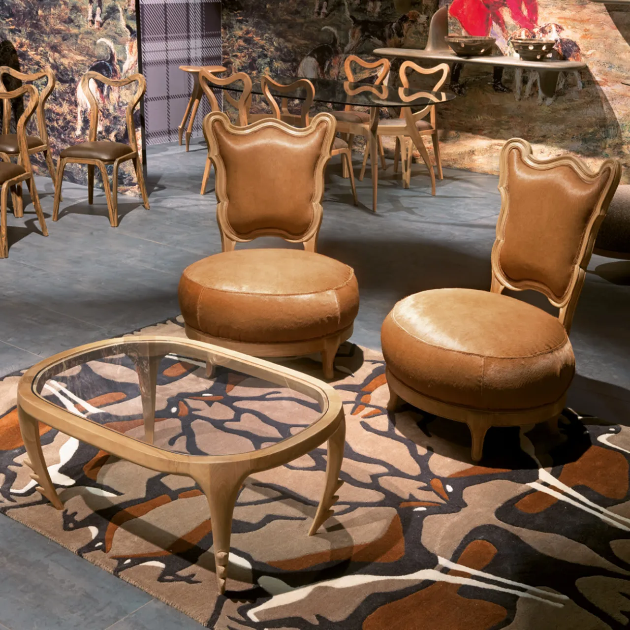 La poltrona lounge Gattona di Nigel Coates è pensata per l’area lounge. La forma rotonda della seduta, amplificata dall’imbottitura e dal rivestimento in pelliccia di cavallo particolarmente morbida, si ispira a quella di un gatto con il suo pelo morbido e la sua sagoma paffuta, mentre la silhouette dello schienale ne evoca il muso e le orecchie. I piedi di Gattone – realizzati in legno di noce – sono bassi rispetto allo spessore della seduta e alla sua forma, imitando lo stile barocco delle classiche sedie da sala da pranzo.