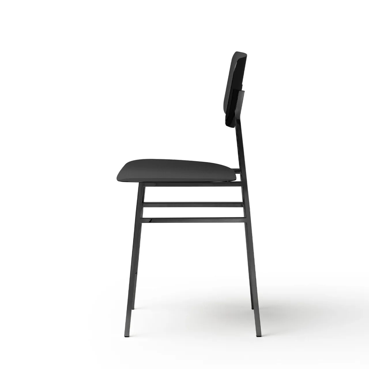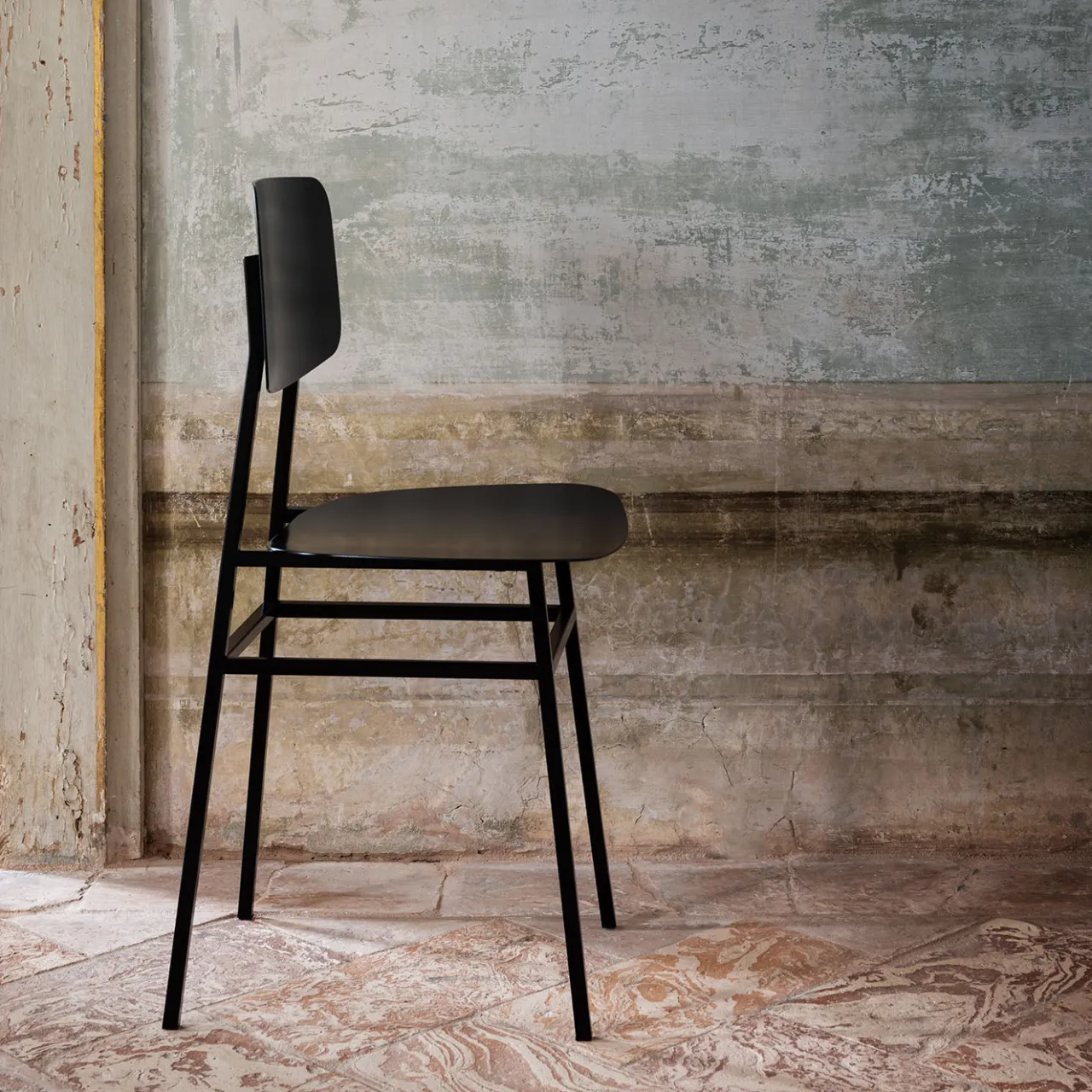 Il desiderio di celebrare il minimalismo funzionale e la sua forza attrattiva ha ispirato Nika Zupanc a creare questa sedia essenziale in acciaio. Proposta in una finitura nera che dichiara inequivocabilmente la sua eleganza senza sforzo, la struttura sembra riecheggiare linee vintage sintetizzandole abilmente con un tocco industriale. Ideale l’abbinamento con la sua controparte da tavolo per un look coeso.