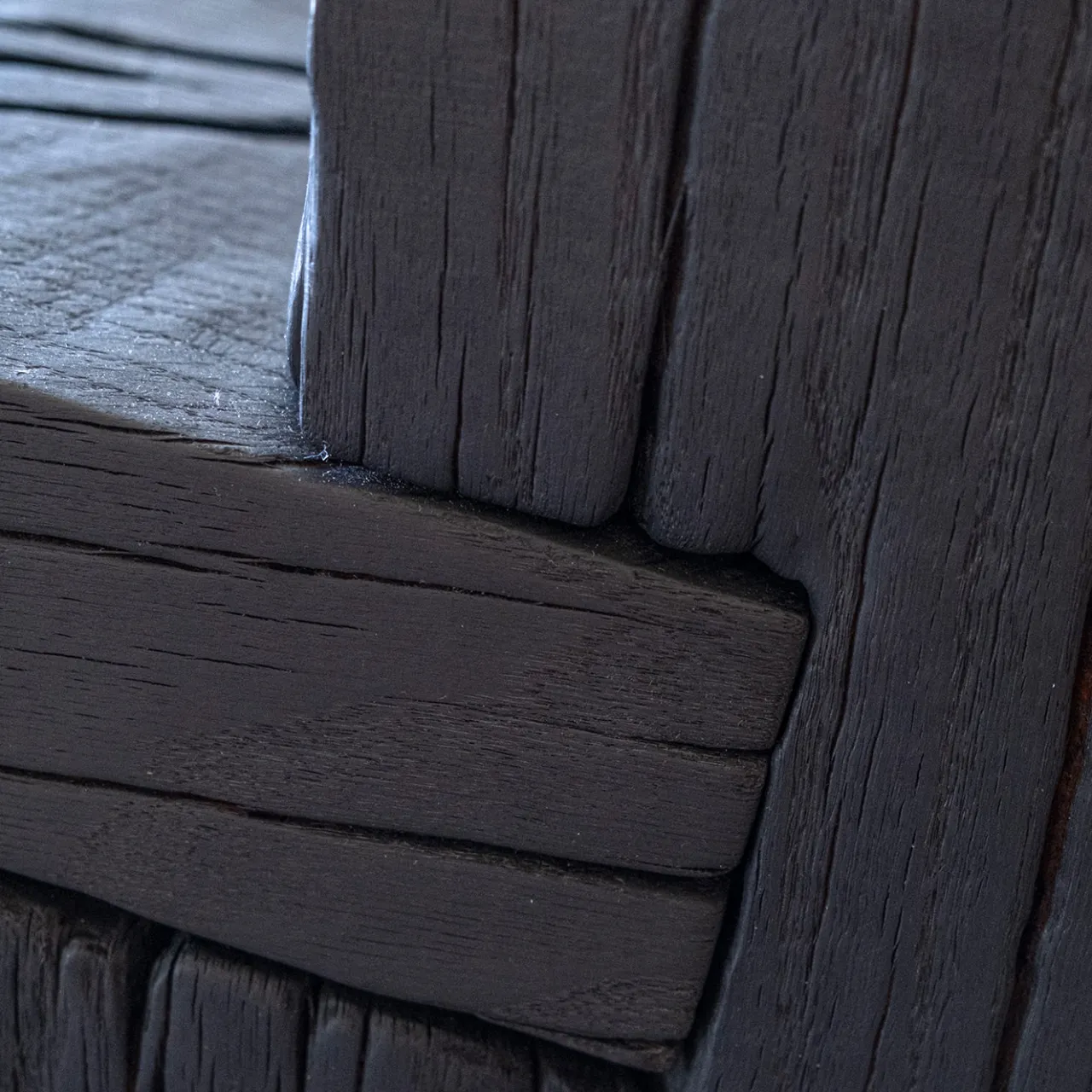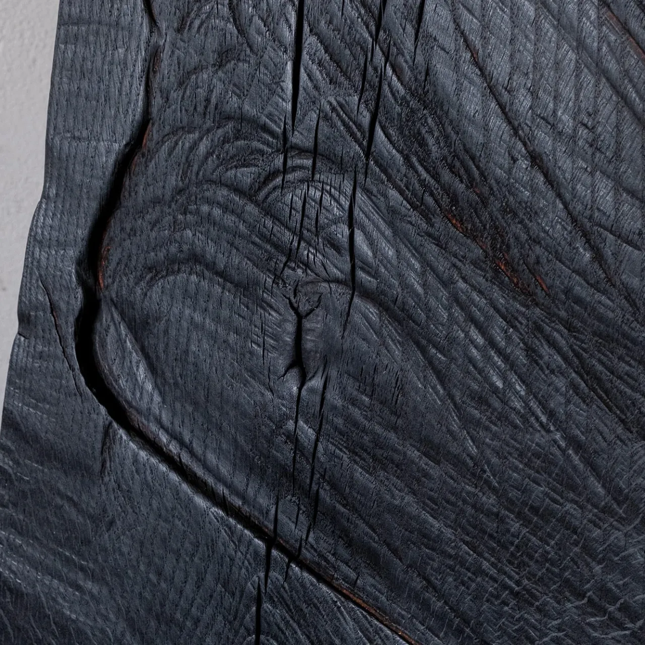 Questo pezzo è più di una semplice sedia, è una scultura monolitica, scolpita a mano da un tronco di quercia massiccia. I segni della lavorazione del legno aggiungono carattere e autenticità, mentre la finitura nera e lucente è ottenuta attraverso la cottura naturale del legno, che mette in evidenza le venature e i dettagli fatti a mano. Ogni pezzo è unico, modellato dai nodi naturali, dalle fessure e dalle venature del legno. Sottili spostamenti, crepe e movimenti naturali sono intrinseci al pezzo, che celebra le sue origini organiche e il suo fascino senza tempo.