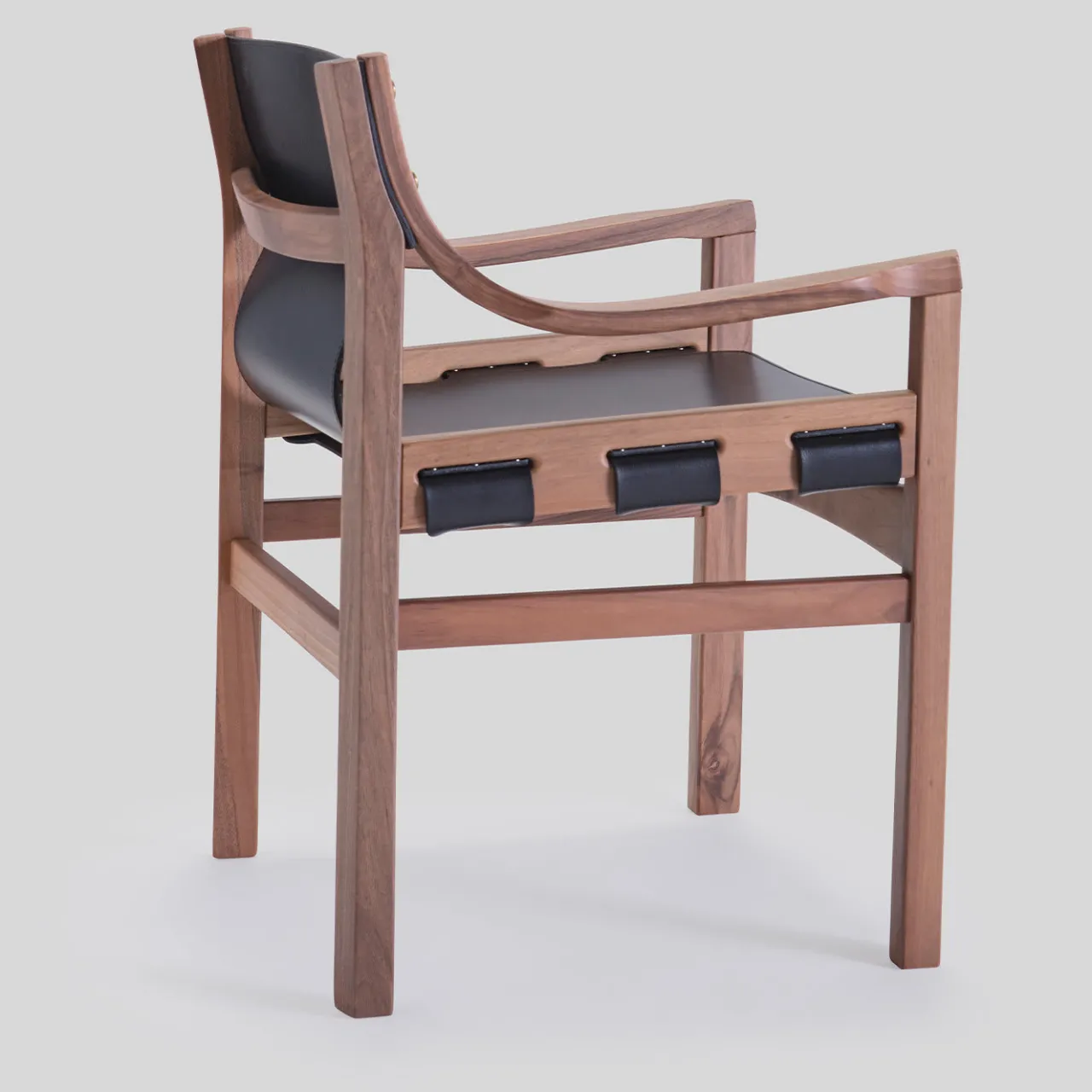 Pezzo iconico delle collezioni Livoni, questa poltrona è stata disegnata per la prima volta nei primi anni Cinquanta. Reinterpretata in chiave moderna pur conservando la sua anima vintage, è una superlativa vetrina di artigianalità. Poggiata su una solida struttura in noce, disponibile anche in faggio, la seduta e lo schienale sono rivestiti in pelle nera, con cuciture fatte a mano ed eleganti fibbie metalliche.