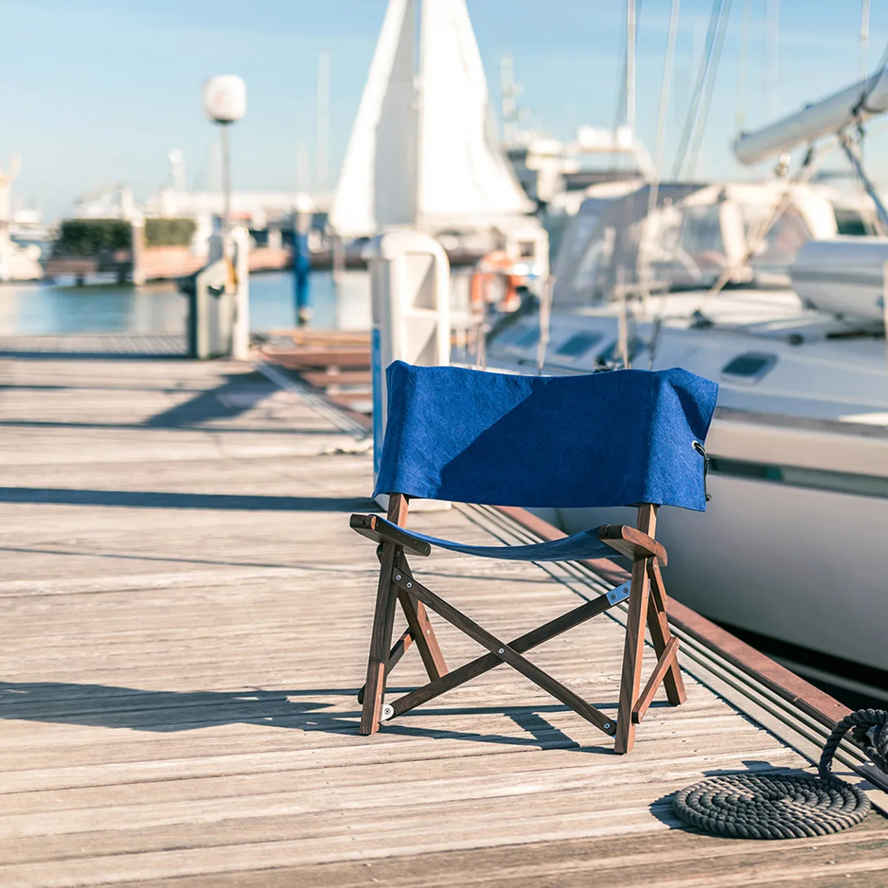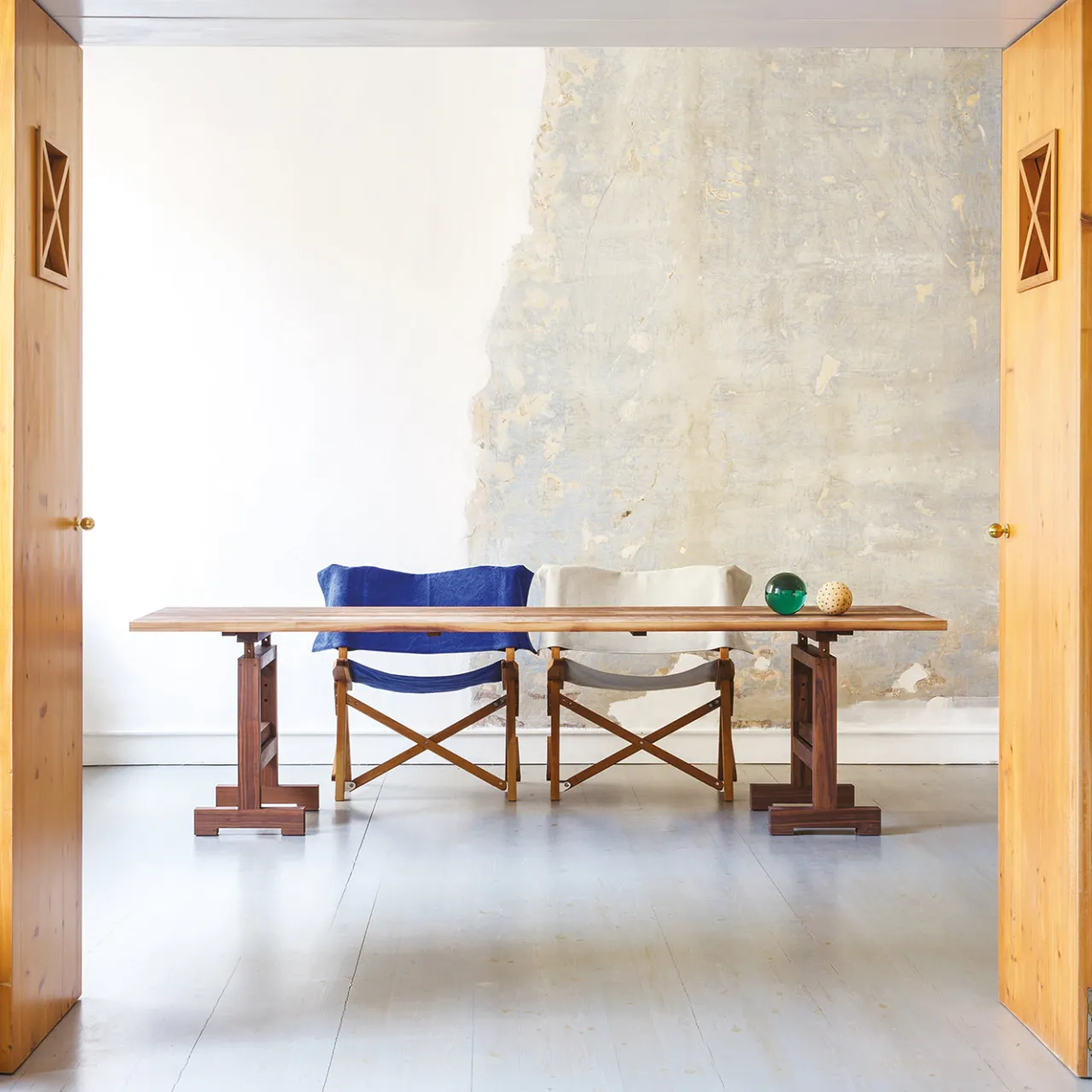 Rivisitazione della tradizionale sedia pieghevole e omaggio a Dino Gavina, che la ripropose nel 1974, questo pezzo arricchisce le proporzioni semplici con dettagli moderni. La struttura è realizzata in massello di noce nero (disponibile anche in legno di iroko) trattato con olio protettivo, con doghe anteriori incrociate e perni in acciaio inox. La seduta e lo schienale sono in tessuto ceruleo e lo schienale è rimovibile e si trasforma in una borsa per trasportare la sedia piegata. Questa sedia trasmette leggerezza visiva in una silhouette confortevole che può passare facilmente dal patio al salotto.