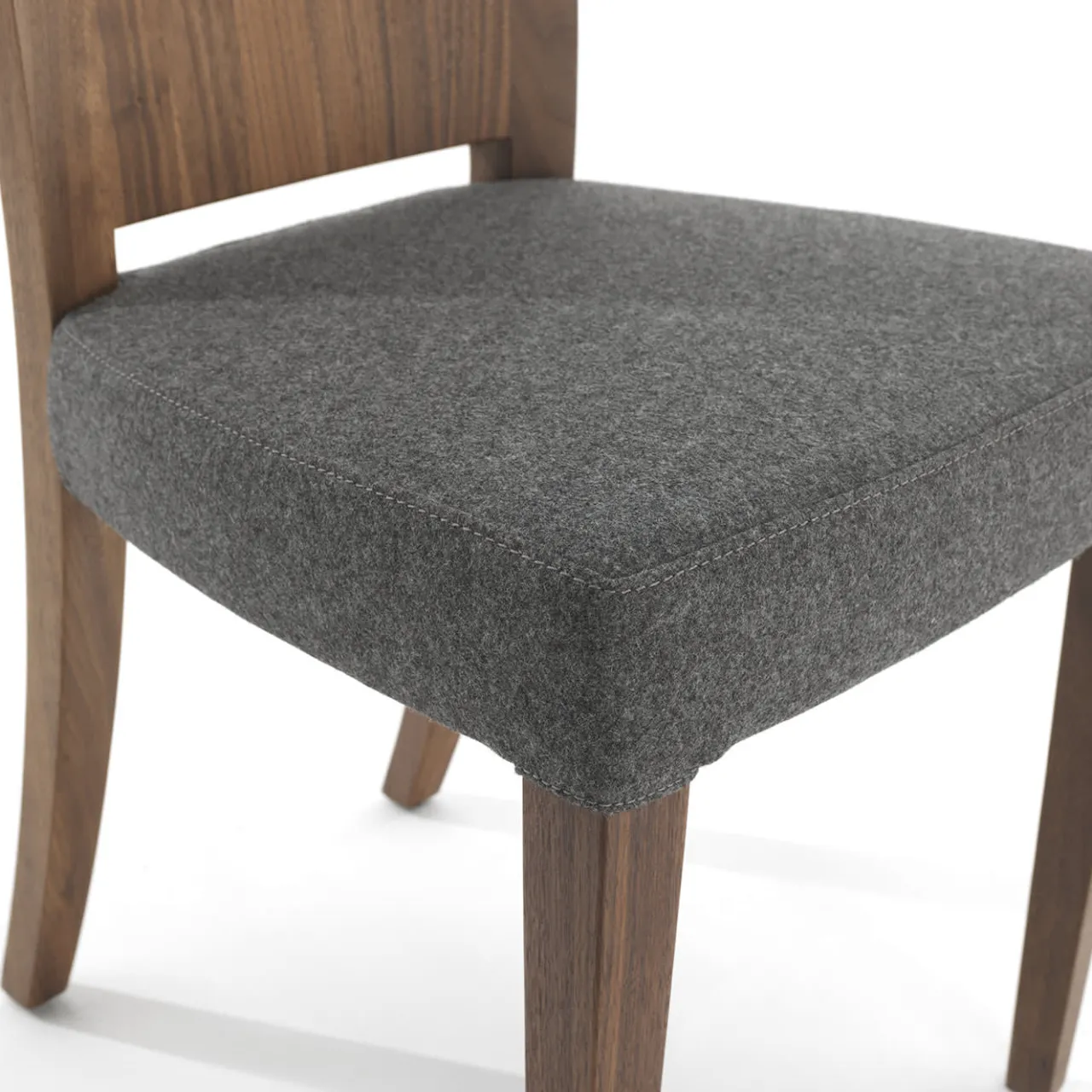 Questa elegante sedia disegnata da Riccardo Arbizzoni è una soluzione raffinata per completare tavoli da pranzo in legno di ispirazione moderna. Realizzata in noce senza nodi e con venature dai toni caldi, garantisce un comfort duraturo grazie al morbido tessuto grigio fumo che riveste la seduta. Una finitura a olio esalta le venature naturali della struttura.