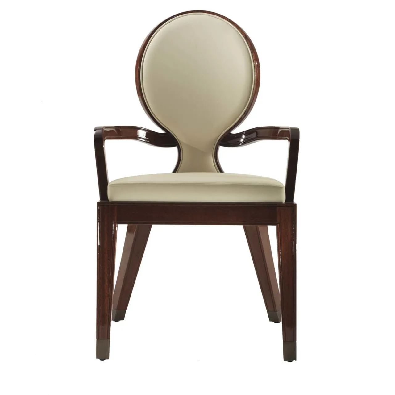 Winged Sun è un’elegante sedia da pranzo strutturata in legno, con finitura in mogano lucido. Realizzata in legno massiccio con finitura in mogano lucido, questa sedia coniuga perfettamente la grazia neoclassica e il fascino moderno. Lo schienale circolare a raggiera, ornato da una rosetta centrale, rende omaggio all’estetica classica, mentre il tocco di lusso è svelato dal rivestimento in pelle morbida su sedile e schienale.