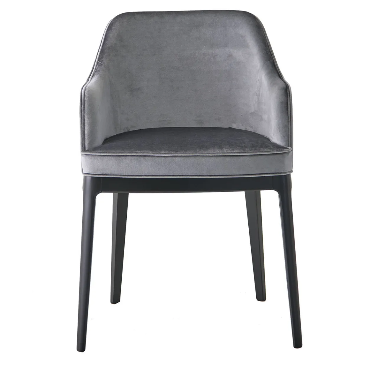 Le linee pulite e le curve armoniose conferiscono a questa poltrona un’eleganza discreta. Ideale da riunire con i gemelli intorno a un tavolo da pranzo contemporaneo, presenta gambe in faggio laccato nero opaco che sostengono la seduta rivestita in elegante velluto grigio. Il comfort di lunga durata è favorito dai fianchi sinuosi della scocca e dalla generosa imbottitura in schiuma, foderata con fibre termoregolate e sigillata da cinghie elastiche.