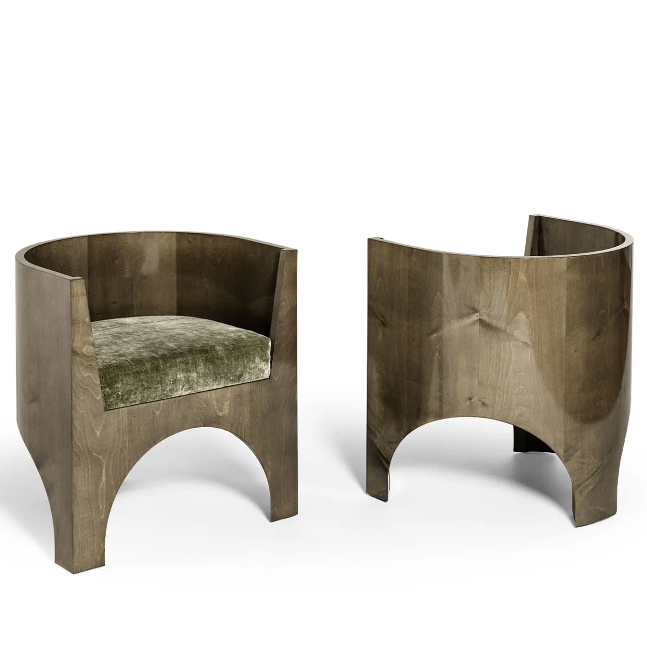 La sedia in legno Volta presenta una silhouette compatta con gambe arcuate che formano forme morbide e fluide, ricordando collage architettonici radicali. Realizzata in legno d’acero tinto di verde con finitura lucida, unisce l’estetica contemporanea a un raffinato tocco rétro ispirato agli interni degli anni ’70. Il cuscino fisso del sedile è rivestito in morbido velluto, che aumenta il comfort e la comodità. Il cuscino fisso della seduta è rivestito in morbido velluto, che aumenta il comfort e aggiunge una sottile texture al design.