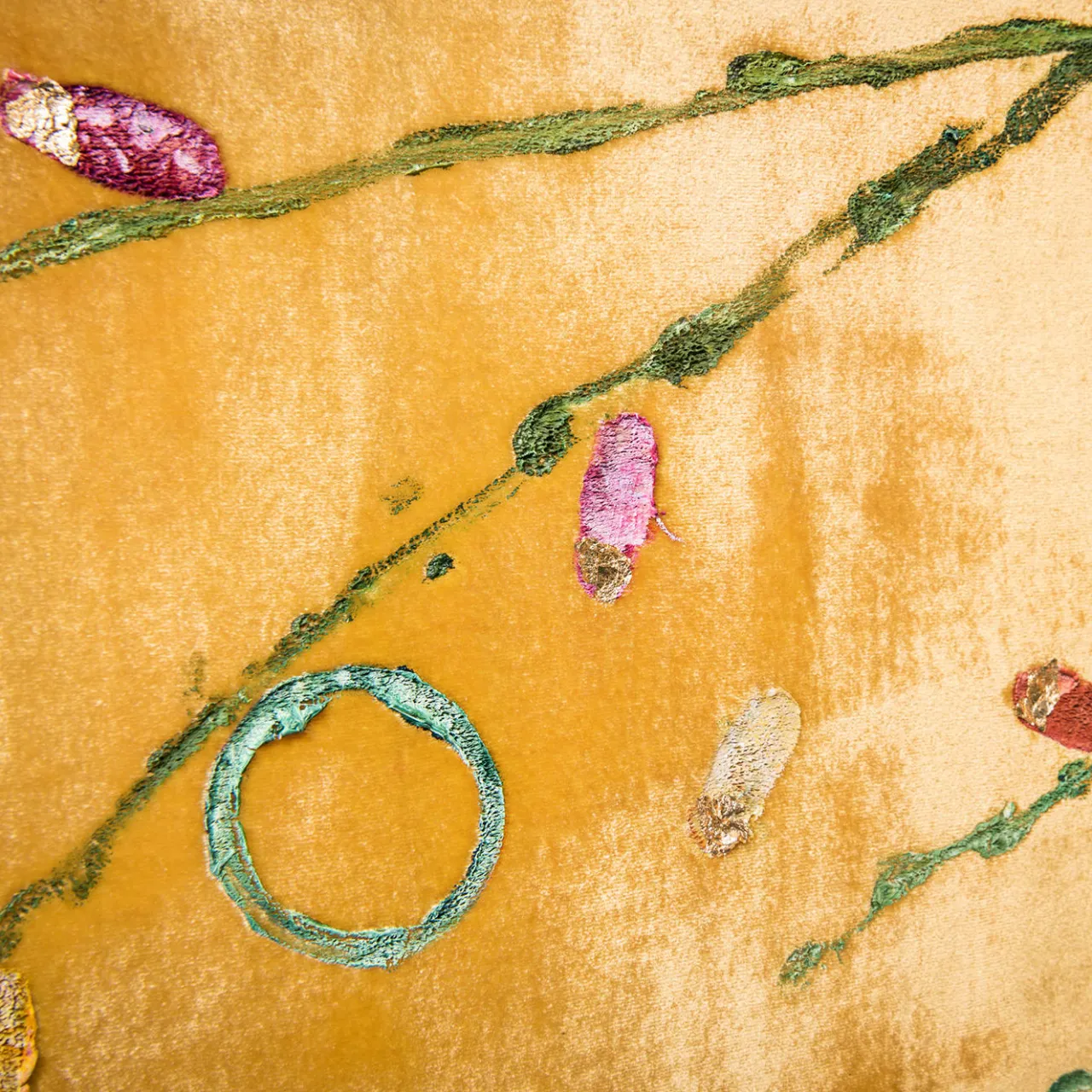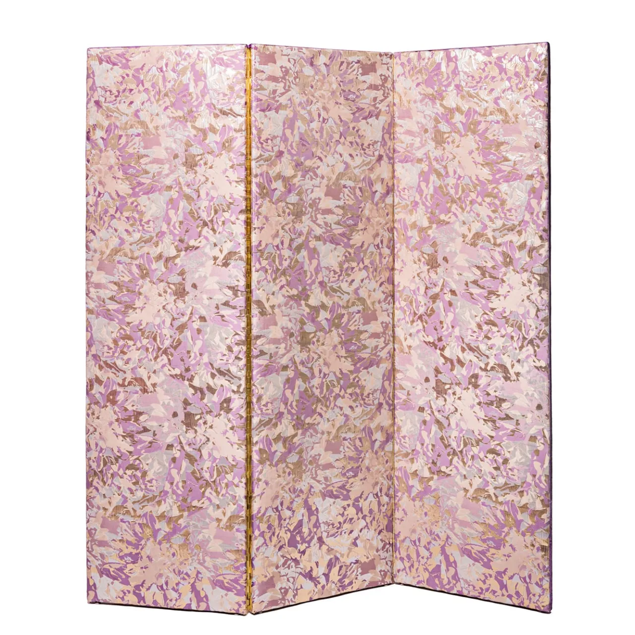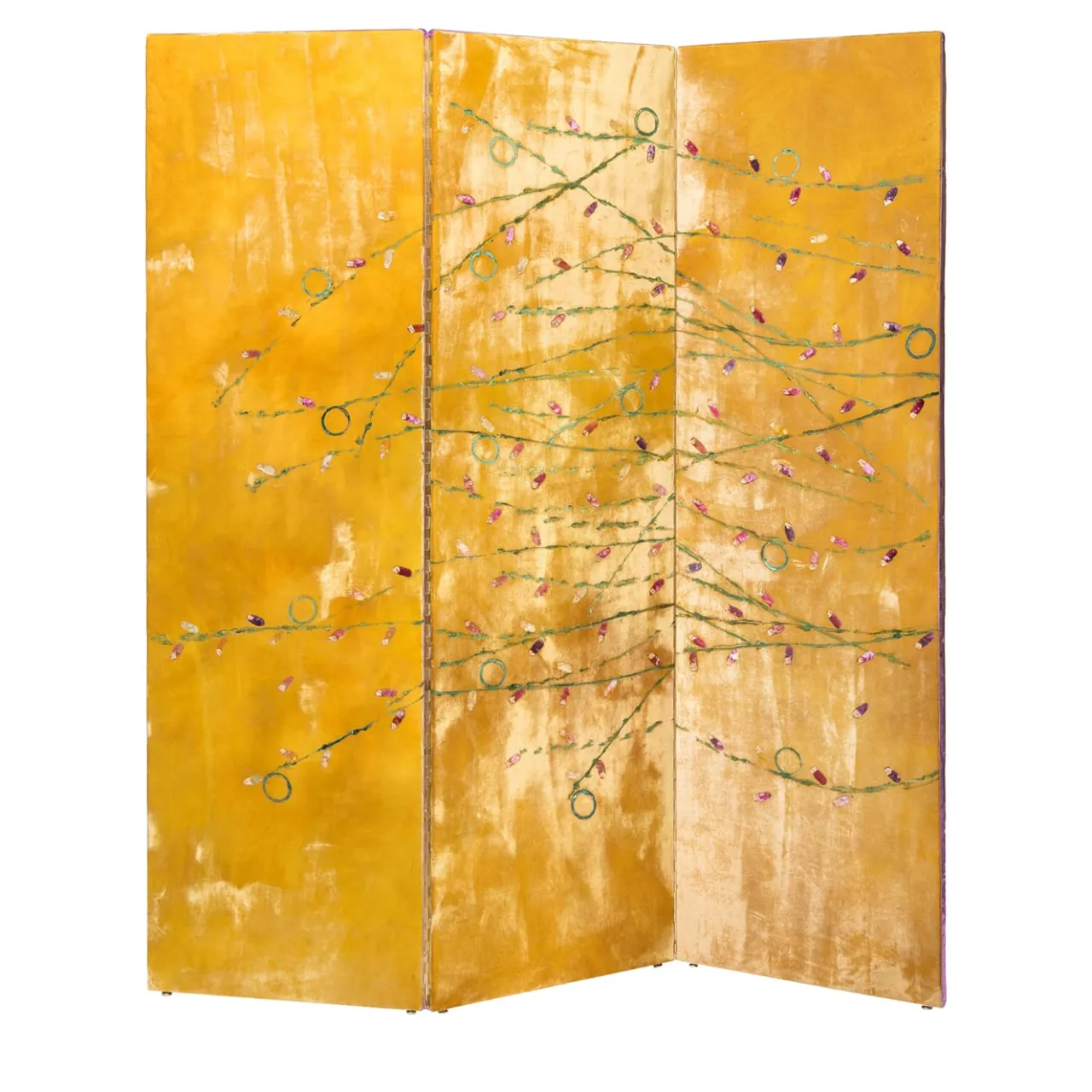 Questo squisito paravento in velluto di seta è un pezzo di design unico. Ispirato alle cineserie, il velluto è dipinto a mano con pigmenti e paste organiche e presenta rami in fiore su uno sfondo dorato. Il retro presenta un lussuoso broccato di seta rosa. Una fusione tra la tradizione degli arazzi veneziani e l’estetica contemporanea, questo paravento è un capolavoro senza tempo che aggiunge un tocco di opulenza a qualsiasi spazio sobrio.