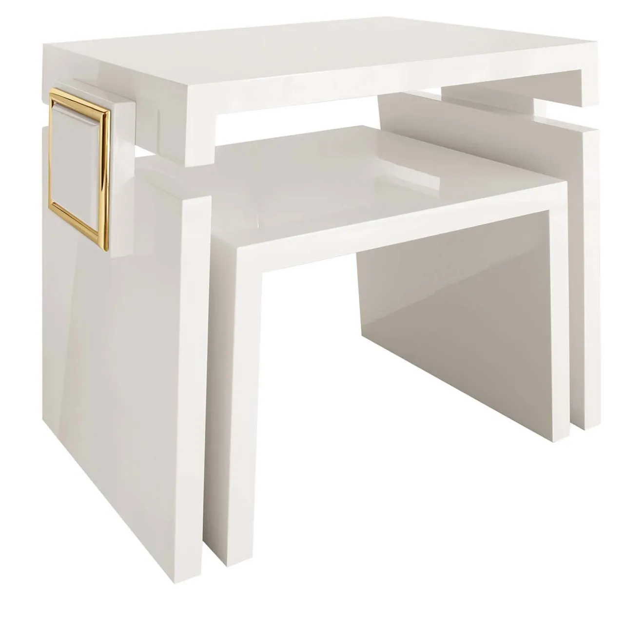 Questi lussuosi tavolini da salotto creano uno stile minimalista ma molto elegante che si adatta a qualsiasi arredamento. Realizzati in legno con finitura laccata bianca lucida, i tavolini misurano 80 x 55 x 66H cm e 65 x 55 x 45H cm, e quello grande è impreziosito da un quadrato su ogni lato delineato da una cornice in ottone dorato lucido che rappresenta l’elemento distintivo della serie Felix disegnata da Giannella Ventura.