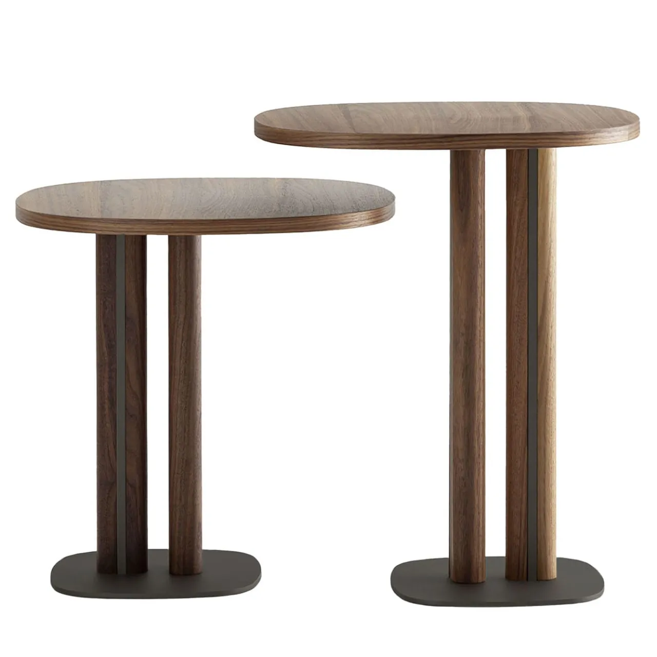 Intriganti nelle loro silhouette asimmetriche, questi due tavolini si ispirano alla Grande Mela e al suo iconico quartiere downtown fiancheggiato da due fiumi. La disposizione geografica della città è poeticamente attualizzata attraverso l’anima centrale in metallo brunito, verniciato con polveri epossidiche e racchiuso da una coppia di inserti in massello di noce canaletto. Un piano in MDF di 19 mm di spessore, perfezionato da un’impiallacciatura in noce canaletto, ne suggella il design esclusivo.