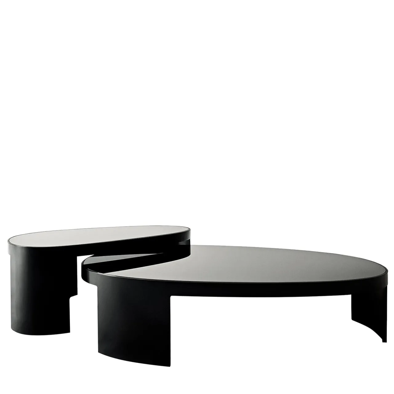 Questo raffinato set di due tavolini da caffè, ispirato alle forme delicate delle gocce, completerà sicuramente gli eleganti set da salotto con un tocco scultoreo. Caratterizzati da un design leggermente a nido, i due pezzi presentano tre gambe audaci il cui design curvo non aggiunge spigolosità all’ispirazione originale. Realizzati in metallo nero, sono sigillati da piani d’appoggio in vetro riflettente.