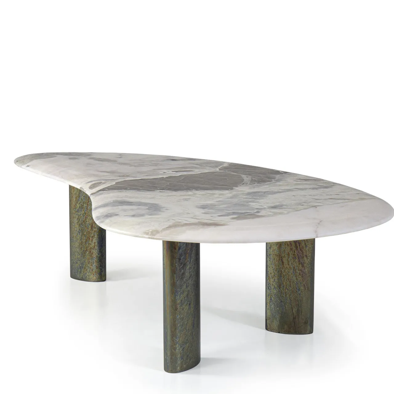 Il set di tavolini Egeo, disegnato da Andrea Andretta, è composto da tre elementi con piani a forma irregolare dai bordi convessi, ispirati a un arcipelago che affiora dal mare. Ogni tavolino presenta dimensioni e materiali distinti: il modello basso (110×65 cm, h30 cm) un top in marmo Oyster White, quello intermedio (78×68 cm, h40 cm) un top in legno di rovere Light Brown e quello alto (55×45 cm, h50 cm) un top in marmo Verde Alpi. Le gambe ellittiche in metallo di finitura Ardesia esaltano la composizione, pensata per creare un’atmosfera contemplativa, tra essenzialità e armonia naturale. Sono disponibili finiture alternative e opzioni di personalizzazione; si prega di contattare il Concierge per maggiori informazioni.