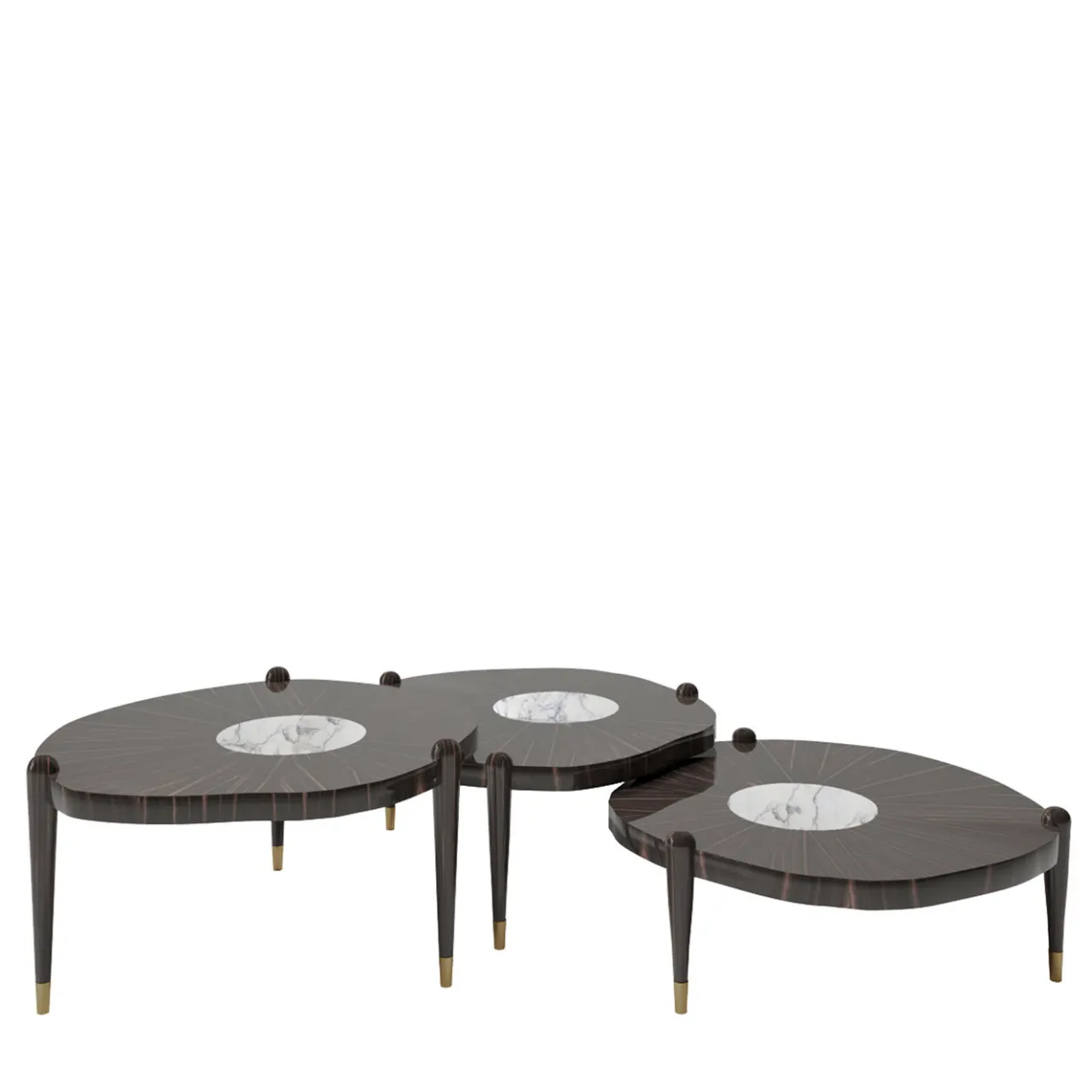 Organico ma assolutamente chic, questo set di tavolini nidificanti è realizzato in ricco ebano con inserti rotondi in marmo Calacatta. Un centrotavola straordinario per salotti formali, i tavolini offrono un ampio spazio espositivo per bevande e antipasti prima di una cena elegante. Tappi color bronzo inclusi.