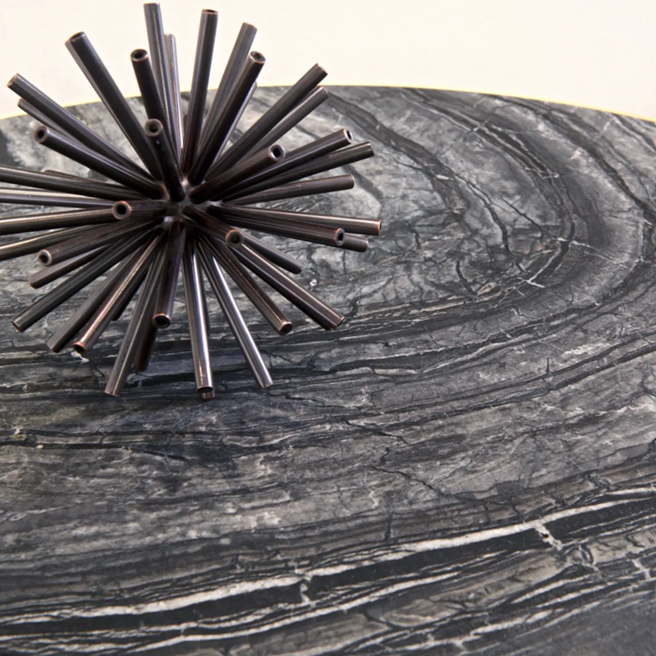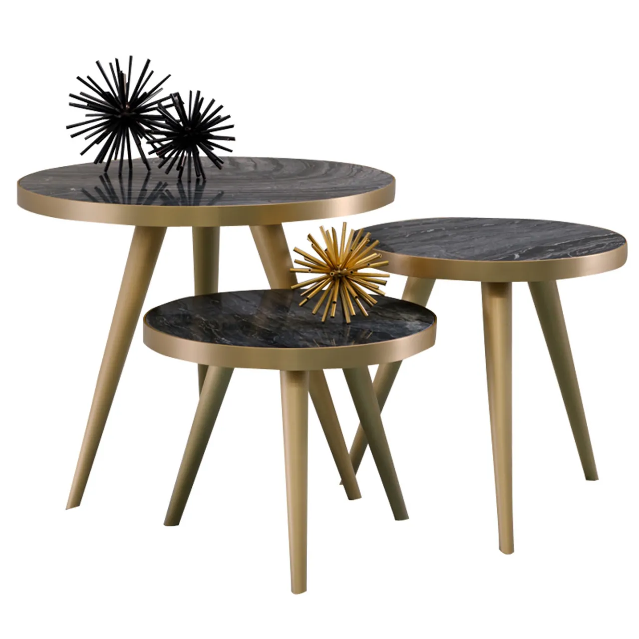 Sapientemente realizzato e dal design elegante, questo set di tre tavolini presenta una struttura in ottone rivestito con una finitura satinata che risplenderà in un arredamento moderno. Il piano rotondo in marmo Zebra (spessore 4 cm) è elegante e le tre gambe coniche sono inclinate verso l’esterno per garantire la stabilità e consentire diverse configurazioni che diventeranno il punto di riferimento estetico di un angolo del soggiorno o di un foyer. I tavoli misurano (in cm): 80 L x 66 H, 56 L x 45 H e 56 L x 56 H. Il piano è disponibile anche in vetro.