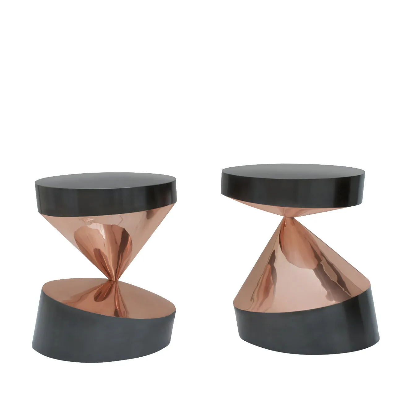 Questi due sorprendenti pezzi di design d’interni sono audaci ed eleganti e il loro fascino contemporaneo si integra con un arredamento moderno, facendo bella mostra di sé in qualsiasi stanza in cui vengono collocati. La struttura di entrambi i tavoli utilizza basi irregolari su cui i piani sembrano in equilibrio, creando un effetto dinamico. I materiali nobili scelti, ottone bronzato per i piani e le basi e rame per il supporto strutturale, aggiungono una nota classica ai pezzi.