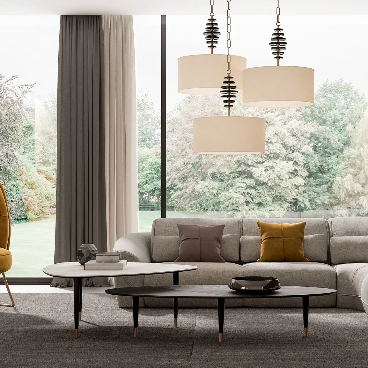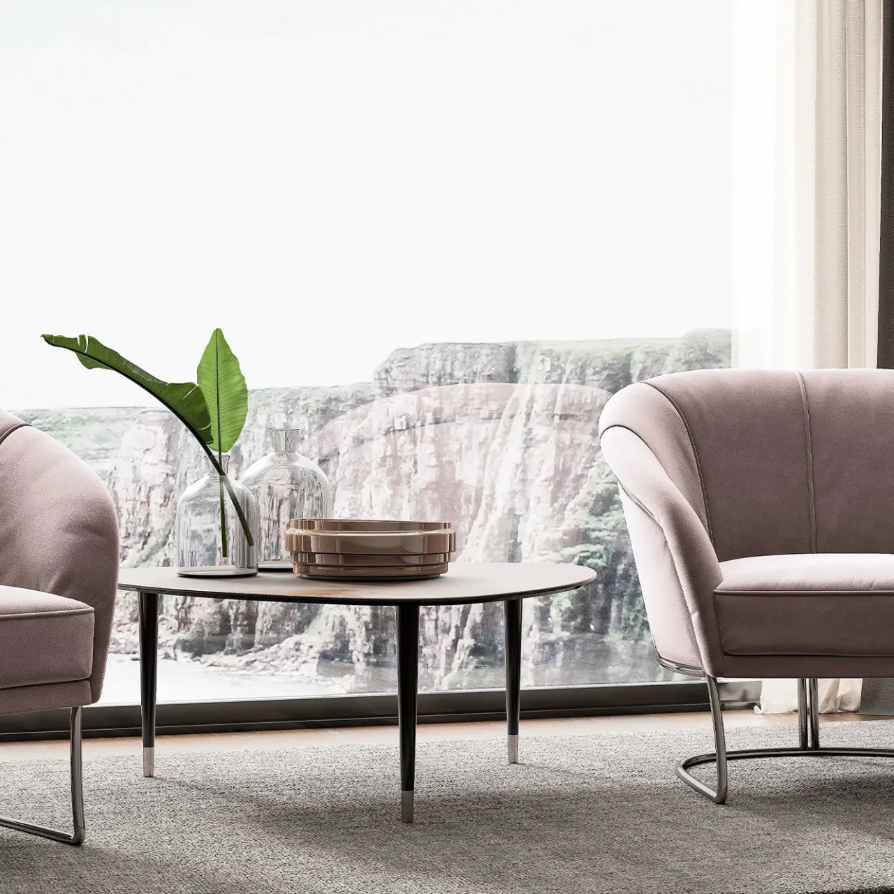 Realizzato con cura e versatilità, questo set comprende due tavolini che possono essere esposti insieme o separatamente in un interno loft open-space. Caratterizzato da un seducente equilibrio di forme geometriche e finiture moderne, il tavolino Surf (Ø150 x 65 x H30 cm) ha un piano oblungo con inserti in laminato intarsiato in Nero Greco, Ossido Nero e Ossido Bruno Rose. Il tavolo Pick (Ø109 x 106 x H42 cm) ha un piano triangolare in laminato Ossido Bruno Rose. Entrambi i tavoli sono sostenuti da gambe in legno laccato nero opaco con ghiere in metallo.