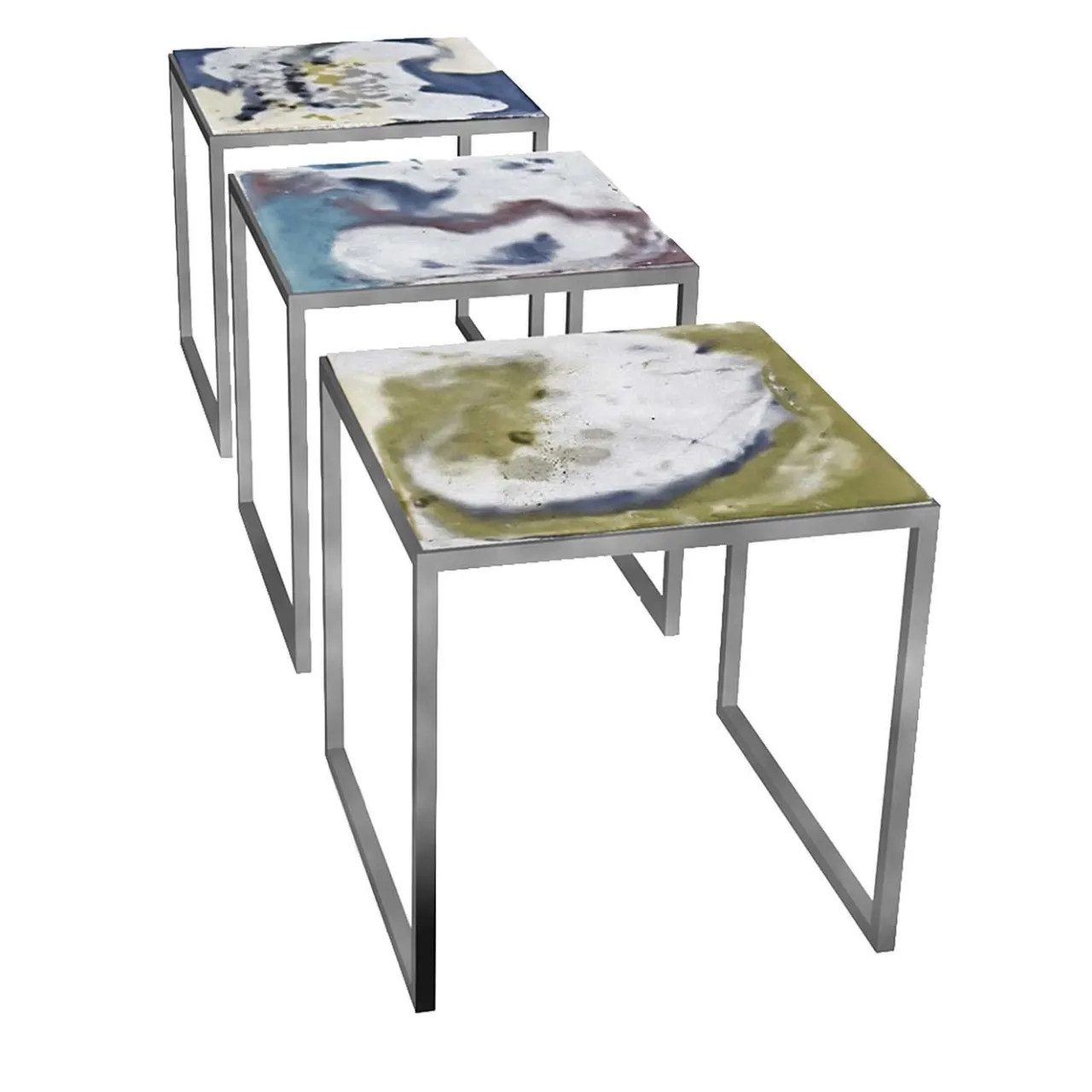 Questo suggestivo set di tre tavolini quadrati è interamente realizzato in calcestruzzo chiaro, colorato con motivi stravaganti e colori vivaci. La base di ogni tavolino è in ferro e crea anche il supporto del piano che sostiene. I tre pezzi hanno dimensioni e altezze diverse per poter essere impilati l’uno sull’altro: 43 x 43 x 50 (h) 39 x 39 x 46 (h) 34 x 34 x 42 (h) cm. Questo set versatile completerà un salotto contemporaneo, aggiungendo colore e un accento dinamico.