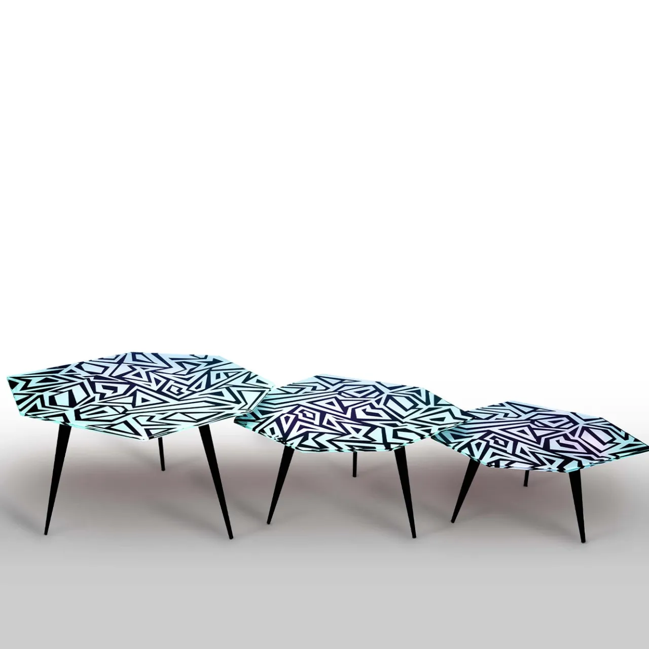 Questo trio di tavolini è caratterizzato da un carattere forte, internazionale, elegante e innovativo. Ogni tavolino è un pezzo unico. È realizzato a mano su ordinazione con la massima cura e attenzione ai dettagli. L’intera struttura portante è realizzata in ottone con finitura nera opaca. Il piano di forma geometrica è in cristallo inciso a mano nella parte inferiore. Ogni pezzo è unico e, a causa della lavorazione artigianale, possono verificarsi lievi variazioni. Per ulteriori informazioni, rivolgersi al Concierge.
