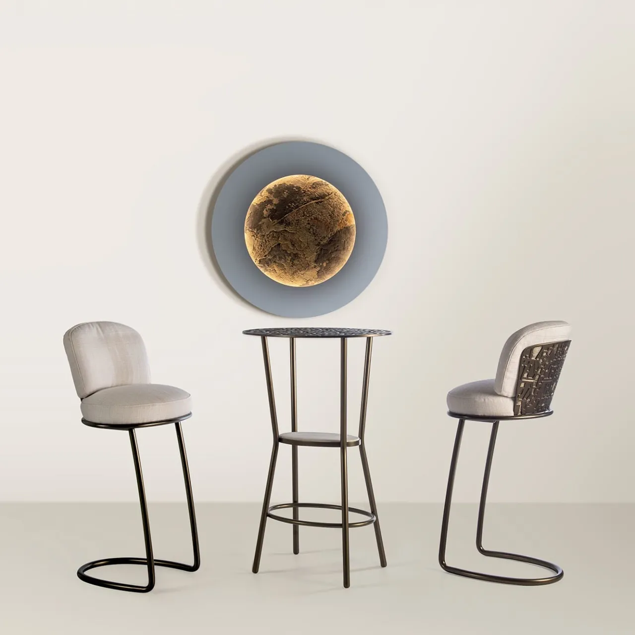 Con una silhouette slanciata e singolare di un’eleganza senza tempo, questo sgabello alla moda appartiene alla collezione di arredi anni ’70. Realizzato in acciaio verniciato a polvere color bronzo e arricchito da un dettagliato schienale in alluminio fuso, è completato da un rivestimento in tessuto bianco-beige per i cuscini della seduta e dello schienale. Per ulteriori dettagli, consultare il Concierge.