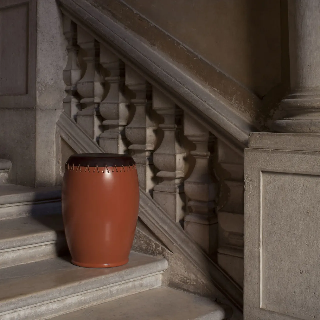 I tamburi tradizionali argentini hanno ispirato questo squisito design artigianale, la cui versatilità lo rende adatto come sgabello basso occasionale, tavolino o comodino. Una pregiata pelle marrone scuro sigilla la parte superiore della sua generosa silhouette realizzata in gres color terracotta, una combinazione che celebra le tradizioni e l’artigianato. È disponibile un’ampia gamma di misure; per maggiori dettagli, contattare il Concierge.