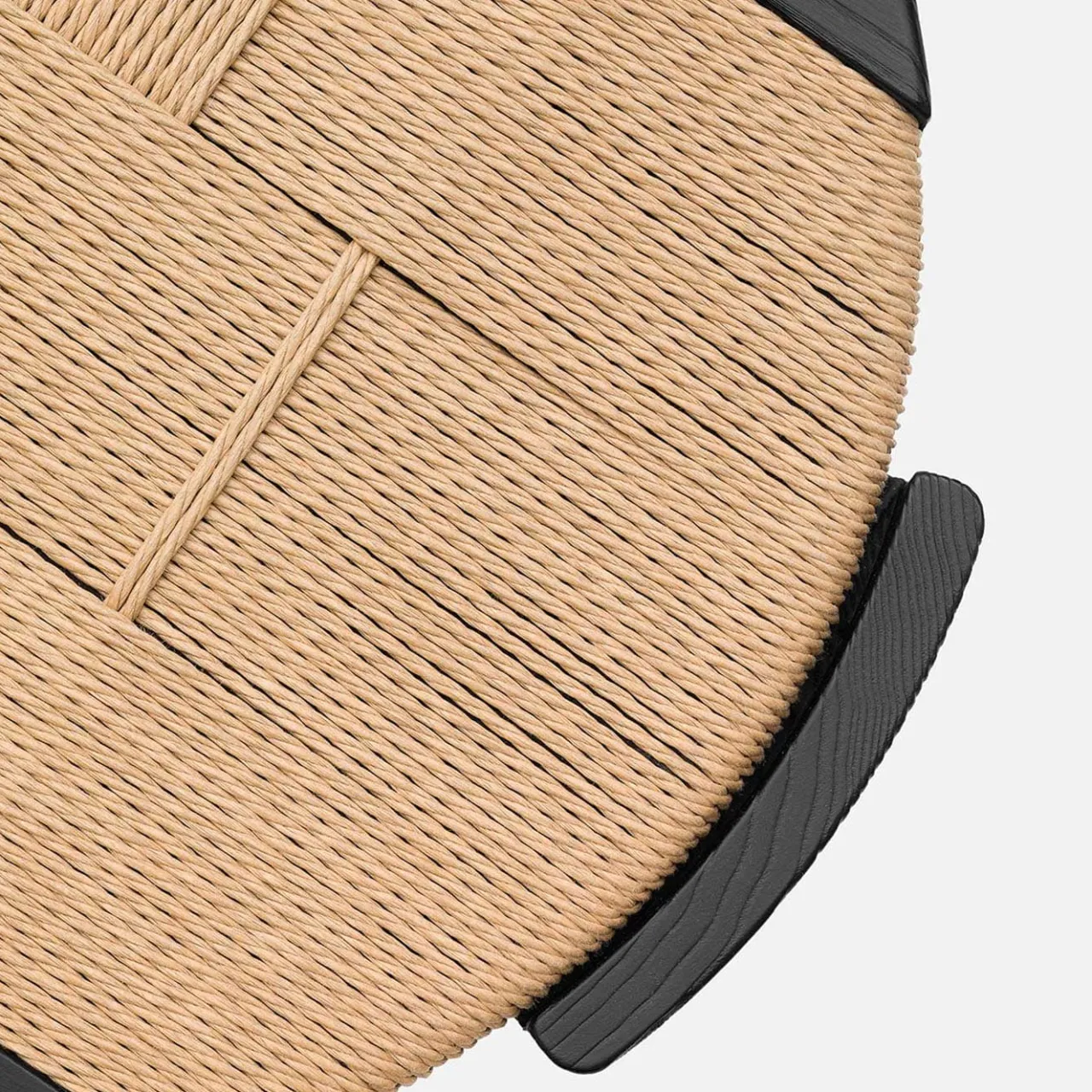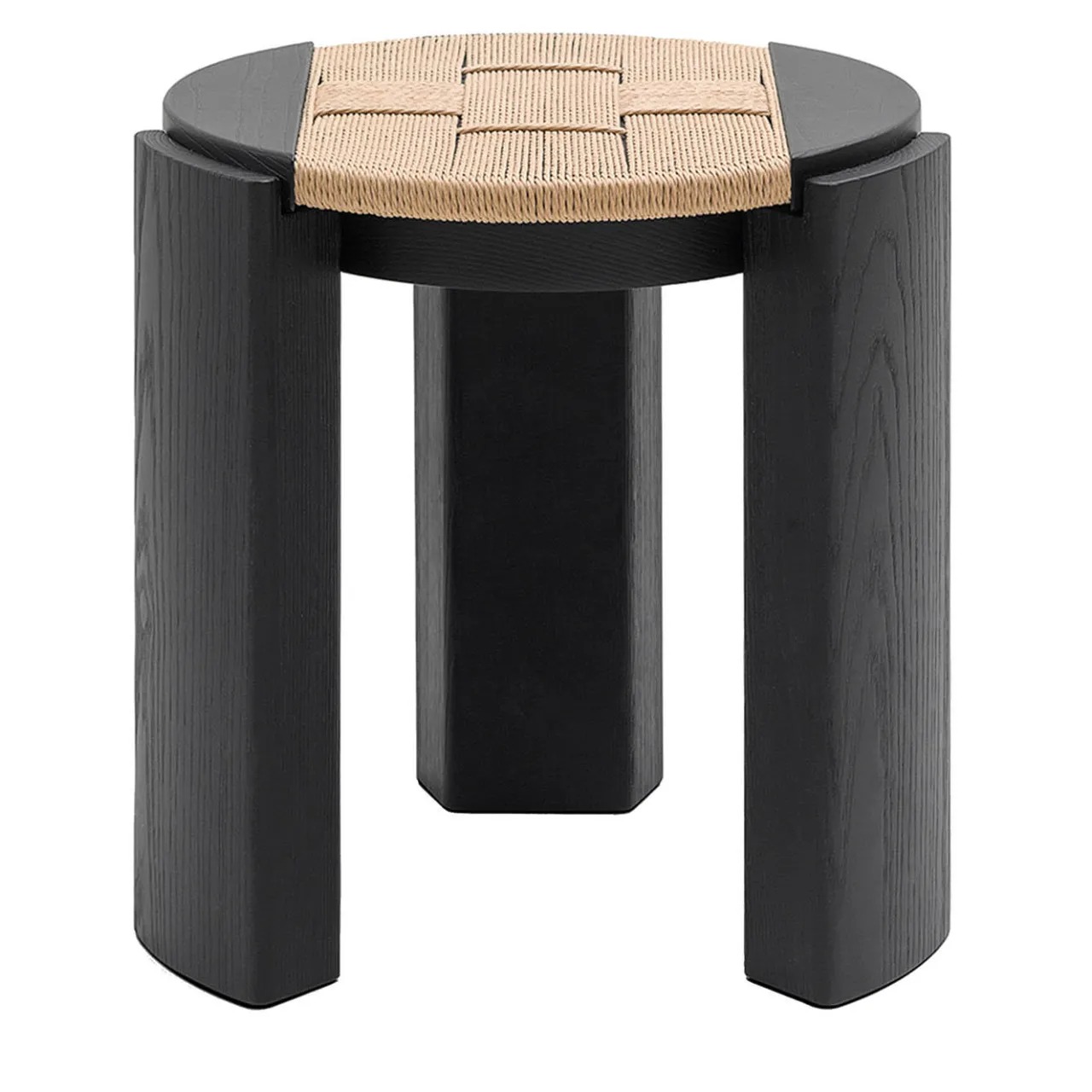 Il design di questo sgabello si basa su segni decisi e volumi primitivi. Il legno massiccio viene modellato e poi pazientemente spazzolato in modo che le venature si sentano al tatto. Le gambe sono elegantemente appoggiate a terra e la seduta, un cerchio lavorato con la tecnica dell’impagliatura, è disegnata con una trama semplice e fitta, composta da fasce di corda che si sovrappongono orizzontalmente all’ordine verticale principale. Disponibile anche in frassino naturale, tinto noce e con intreccio in corda nera.