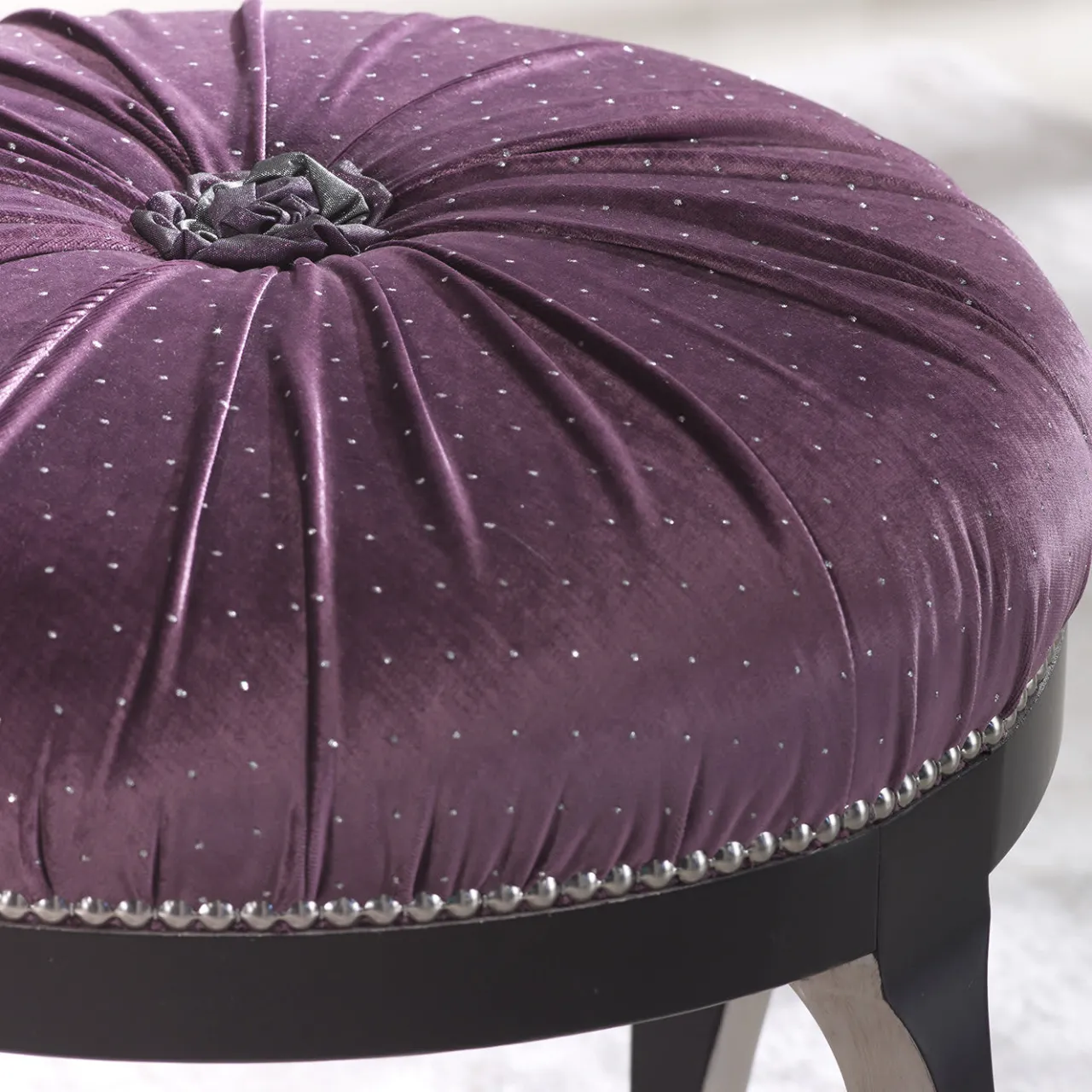 Lo sgabello Colette è stato progettato per essere abbinato alla sedia Colette. Su una base di legno curvilinea, lo sgabello è rivestito di lacca nera lucida e rivestito di velluto color melanzana. La sedia è impreziosita da dettagli in vernice argentata che le conferiscono un tocco decorativo in più. Lo sgabello è realizzato a mano nel nord-est dell’Italia.
