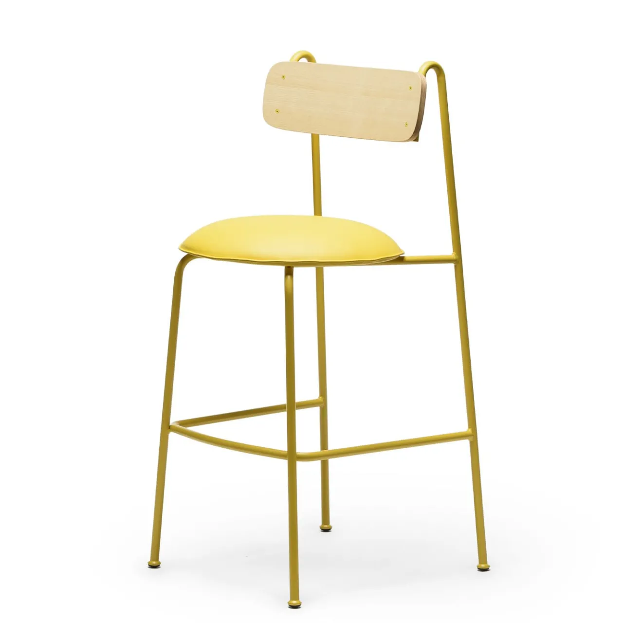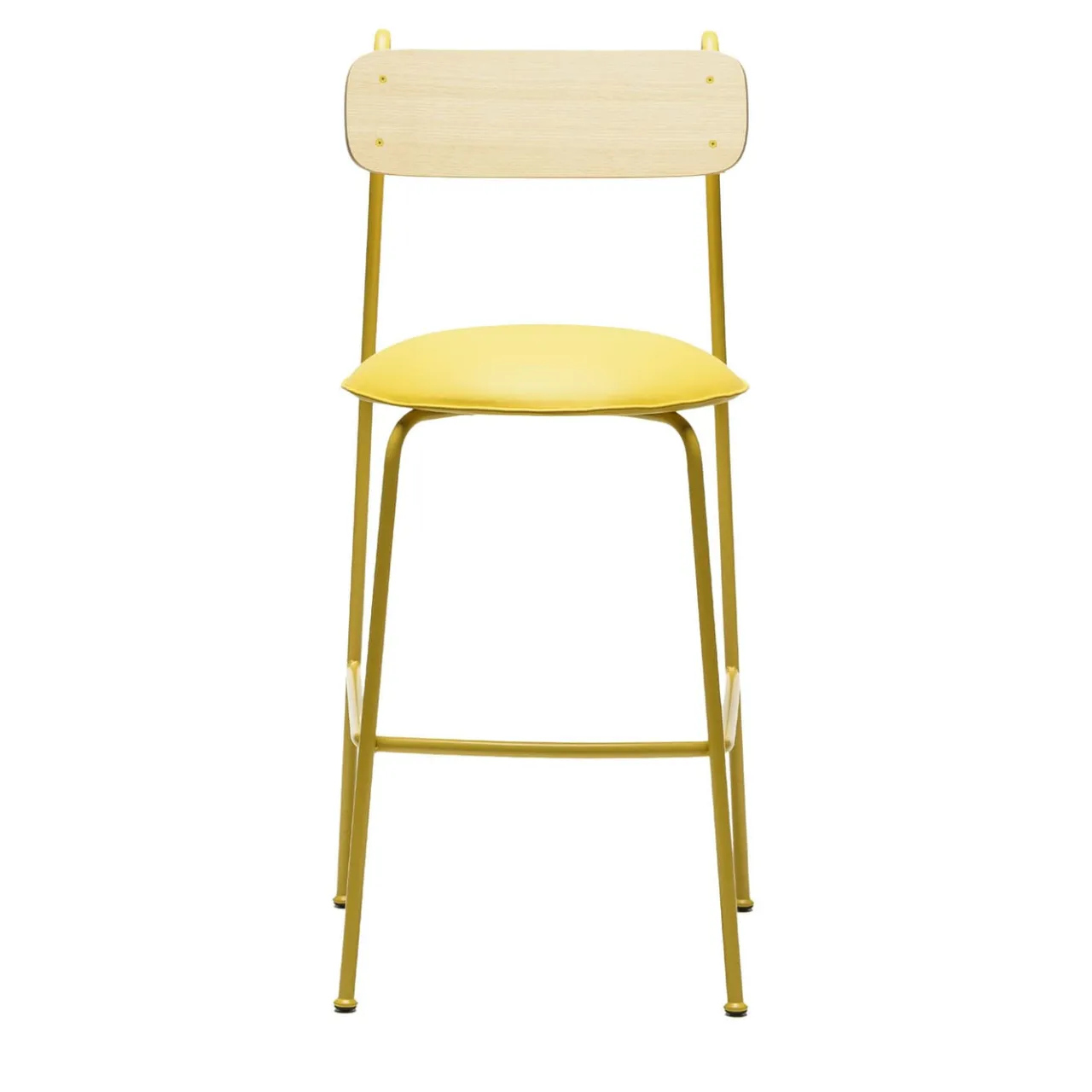 Struttura in metallo verniciato a polvere giallo con schienale impiallacciato in frassino naturale lucido e seduta imbottita in ecopelle gialla. Lena fonde in modo splendido il minimalismo giocoso con l’influenza del design grafico, creando un’armonia accattivante tra stile e praticità. L’elegante struttura in metallo contrasta con la morbida seduta imbottita e ricurva, mostrando un sapiente equilibrio tra forma e comfort.