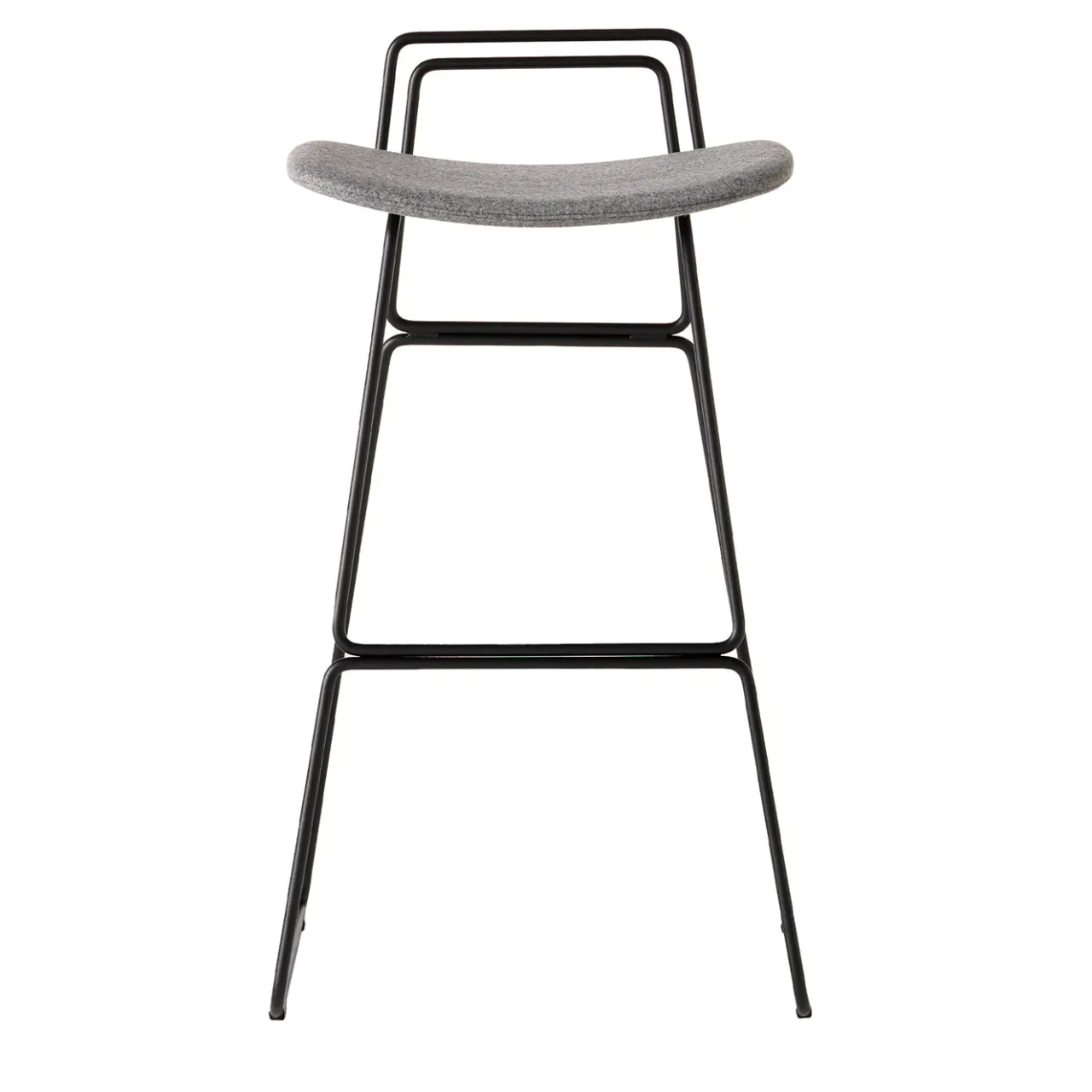 Questo elegante sgabello da bar è caratterizzato da uno schienale in linea e da una seduta imbottita. È arricchito da una base a slitta in acciaio nero opaco.