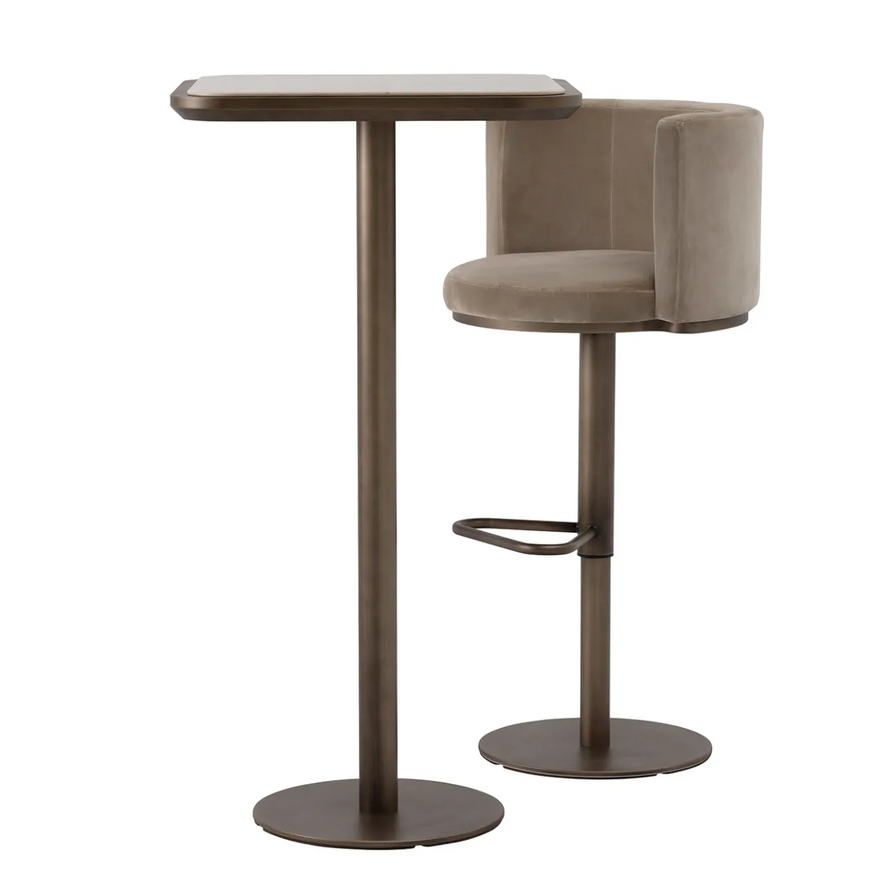 57Parte della collezione Virna, caratterizzata da una silhouette arrotondata e da finiture lussuose, questo sgabello da bar riunisce il meglio dello stile moderno e retrò. Completamente rivestito in velluto color tortora, il sedile girevole è superbamente imbottito in poliuretano per garantire il massimo comfort, arricchito da uno schienale curvo e avvolgente. La base a piedistallo in ferro (non regolabile) con pratico poggiapiedi è rifinita in ottone spazzolato e una protezione per il pavimento in nylon sotto la base rotonda completa questo notevole sgabello da esporre con orgoglio su qualsiasi tavolo da cucina o da cocktail. Certificazioni commerciali e contrattuali disponibili su richiesta.
