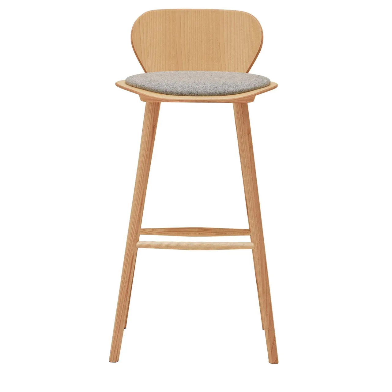 Linee pulite ed essenziali di ispirazione nordica definiscono la silhouette elegante di questo splendido sgabello disegnato da Philippe Bestenheider. Realizzato in legno di frassino naturale, presenta quattro gambe sottili e inclinate con un poggiapiedi che sostiene una seduta curva rivestita in tessuto grigio Flamenco, completata da uno schienale dalla forma simile. Si tratta di un pezzo d’accento ideale per interni privati e contract.