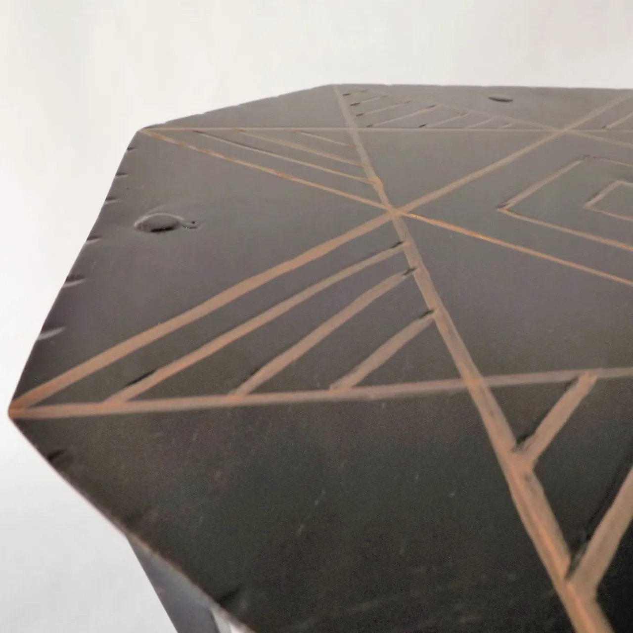 Questo esclusivo sgabello in metallo unisce eleganza e design moderno, rendendolo versatile per qualsiasi spazio, dalla cucina al soggiorno. Caratterizzato da un piano inciso a mano con un motivo rombo ispirato all’arte tessile sarda, riflette i disegni degli anni ’50 di Eugenio Tavolara. La robusta struttura in metallo nero è al tempo stesso artistica e funzionale e mette in risalto le linee geometriche con i dettagli più complessi. Con un’altezza di 40 cm, questo sgabello mette in mostra l’artigianato e il tributo culturale in un pezzo unico.