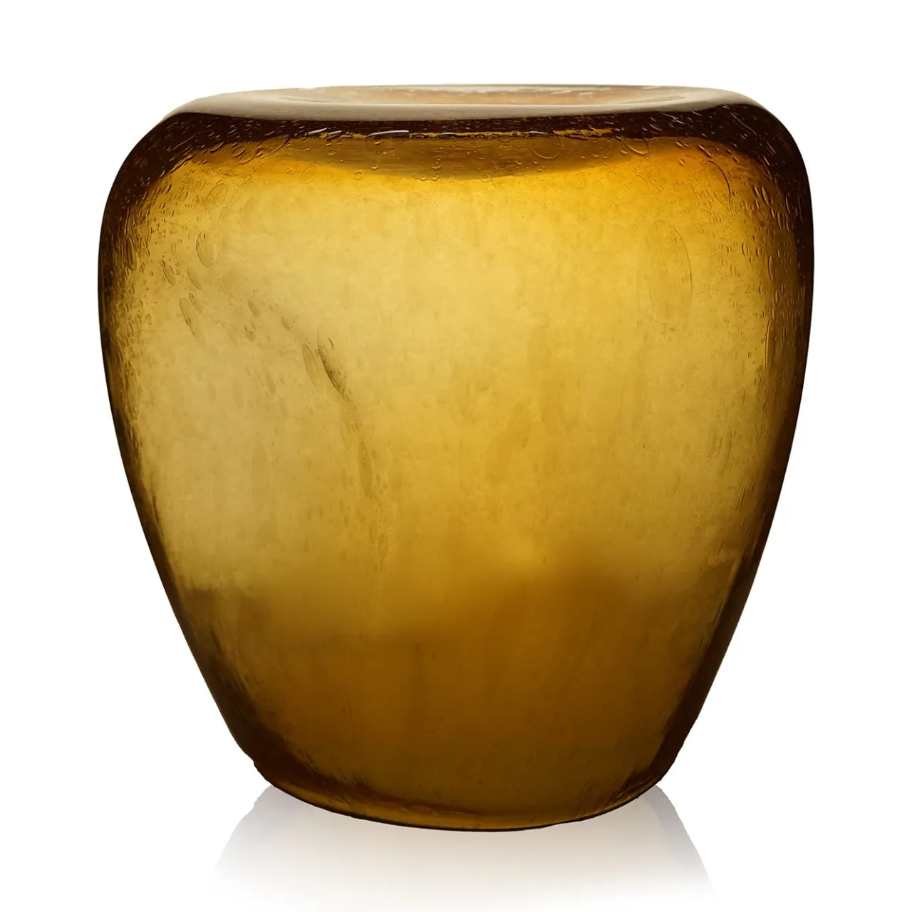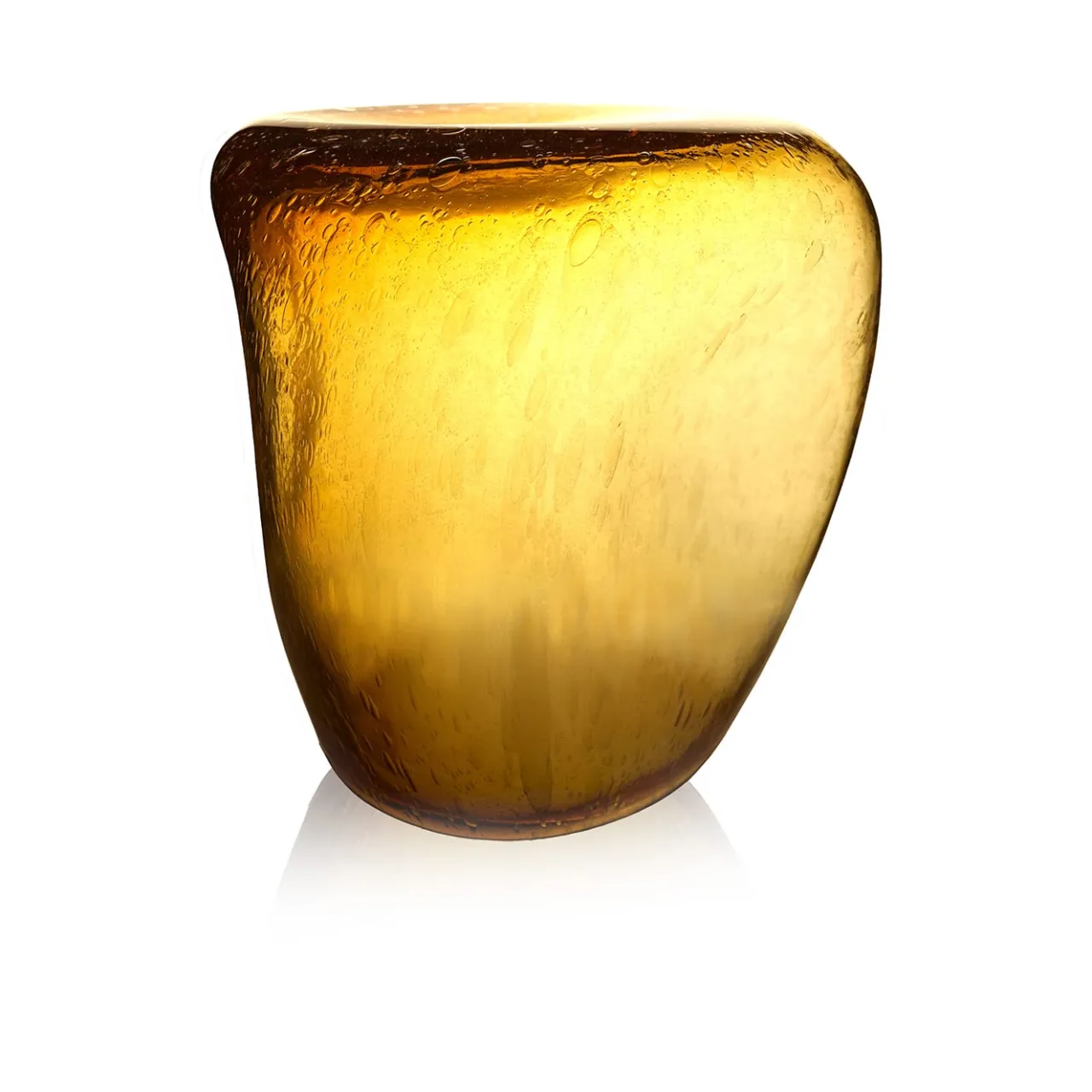 Lo sgabello o tavolo Isola è un capolavoro artigianale in vetro di Murano. Ogni pezzo è unico, plasmato dagli artigiani veneziani attraverso la lavorazione manuale e le tecniche di soffiatura a bocca. Si distingue per le sue grandi dimensioni e per il design intricato, davvero unico nel suo genere. La versione Topazio presenta l’effetto Pulegoso, con le sue caratteristiche bollicine, dette puleghe, create dall’aggiunta di bicarbonato di sodio al vetro fuso, che gli conferiscono una texture accattivante. Un’opera d’arte esclusiva e non replicabile.