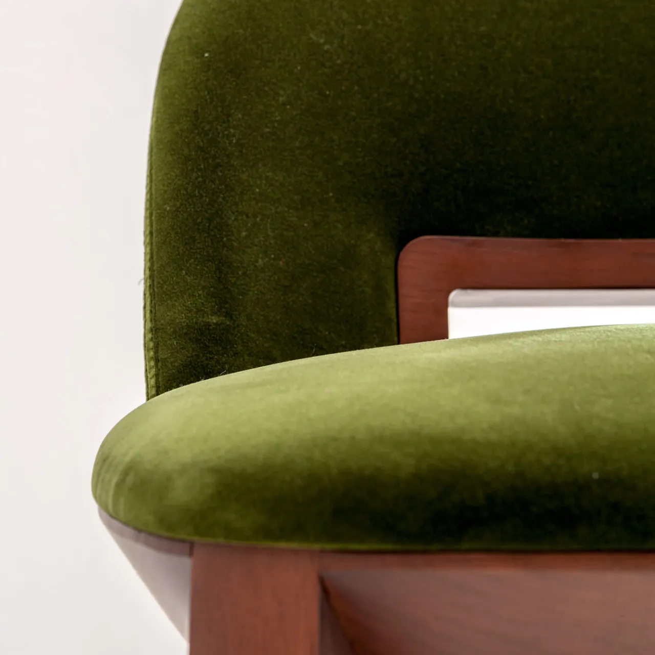 Lo sgabello Margaret, in velluto verde, ha gambe lunghe e sottili che si intersecano con la seduta e lo schienale, conferendo armonia e fascino. Con struttura e maniglia in rovere, il legno può essere tinto in palissandro, teak, wengè, noce nero, noce e rovere. L’elegante seduta e lo schienale sono rivestiti in tessuto o pelle e hanno un’imbottitura in poliuretano espanso.