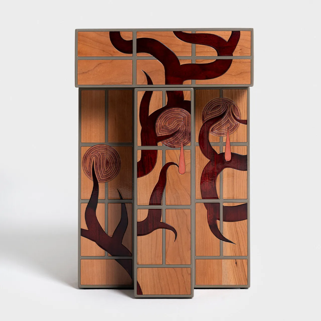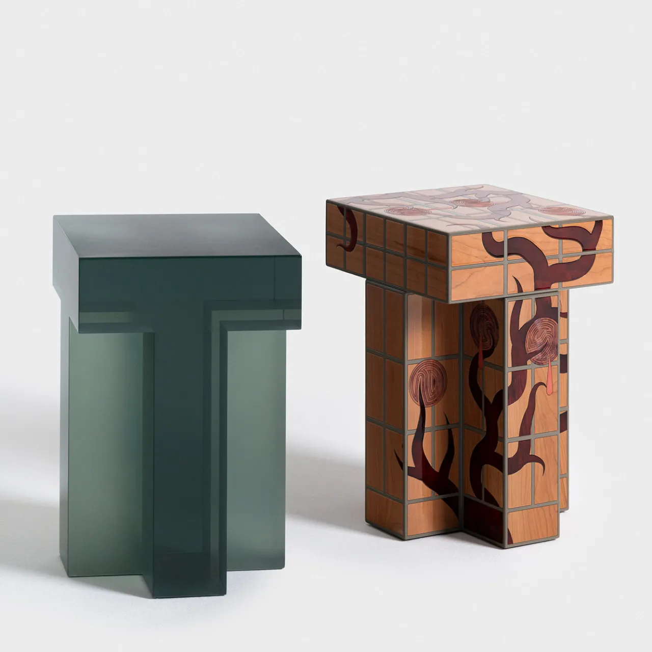 Lo sgabello Orvalho si presenta come un blocco solido scolpito in una precisa forma a T, con tagli graduali lungo i lati che creano prospettive stratificate e dinamiche. Il design bilancia rigore strutturale e motivi organici: viticci e frutti si intrecciano attorno alla forma, rivelando venature, dettagli ornamentali e la complessità della struttura da molteplici angolazioni. La finitura verniciata valorizza il gioco di luci sulla superficie, catturando un momento di maturità naturale sospeso tra ordine e spontaneità. Design di Laurids Gallée.