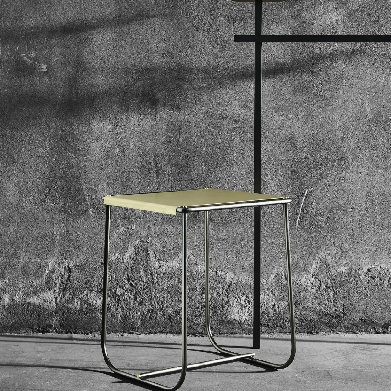 Ilario Innocenti e Giorgio Laboratore hanno progettato questo sgabello contemporaneo composto da due tubi metallici piegati che corrono paralleli intorno alla seduta e sotto di essa per sostenerla. La struttura in ferro è completata da viti in ottone all’estremità dei tubi che arricchiscono questo semplice elemento d’arredo. Versatile e altamente funzionale, questo sgabello è ideale in un ambiente contemporaneo e può essere utilizzato in qualsiasi stanza della casa, compreso l’ingresso e il bagno.