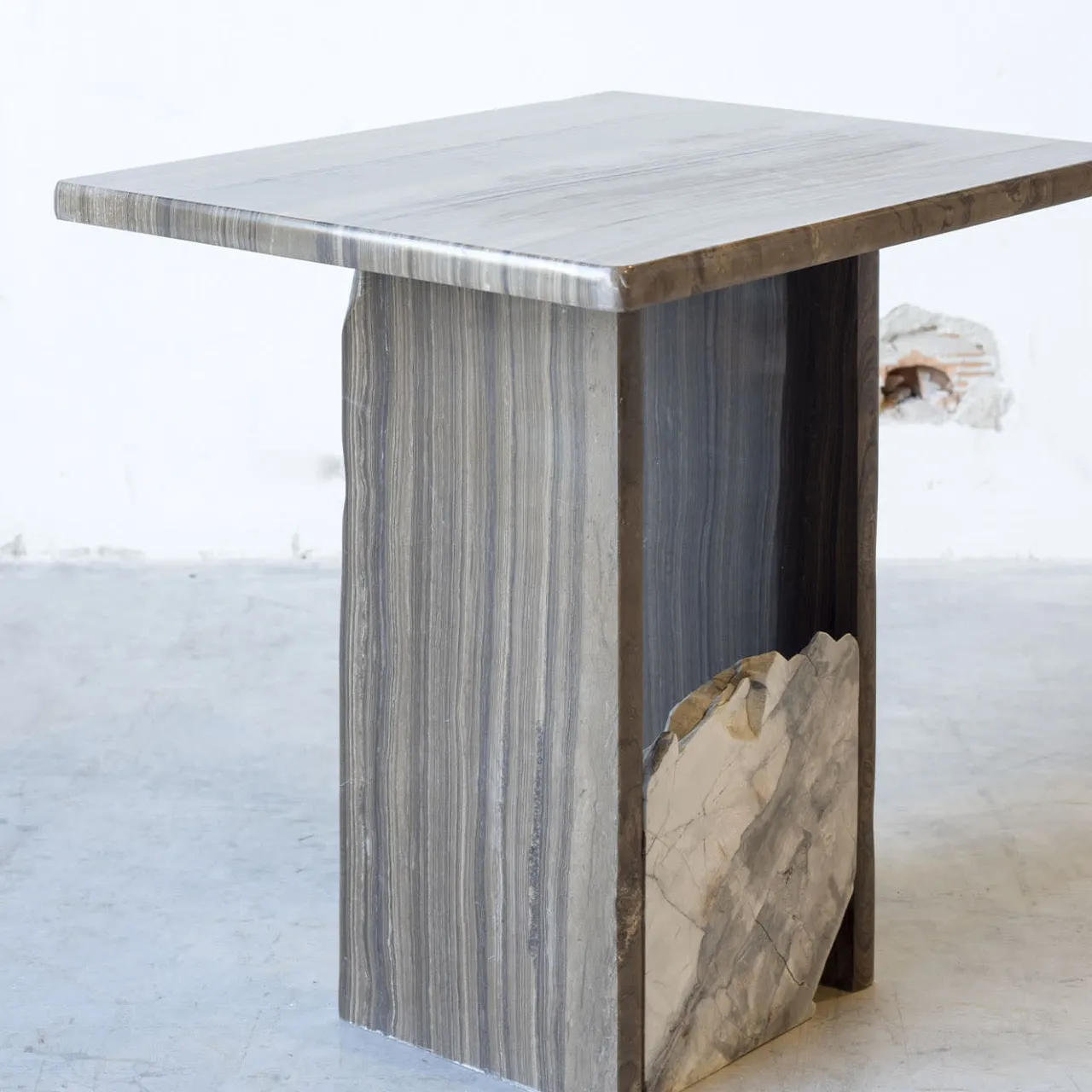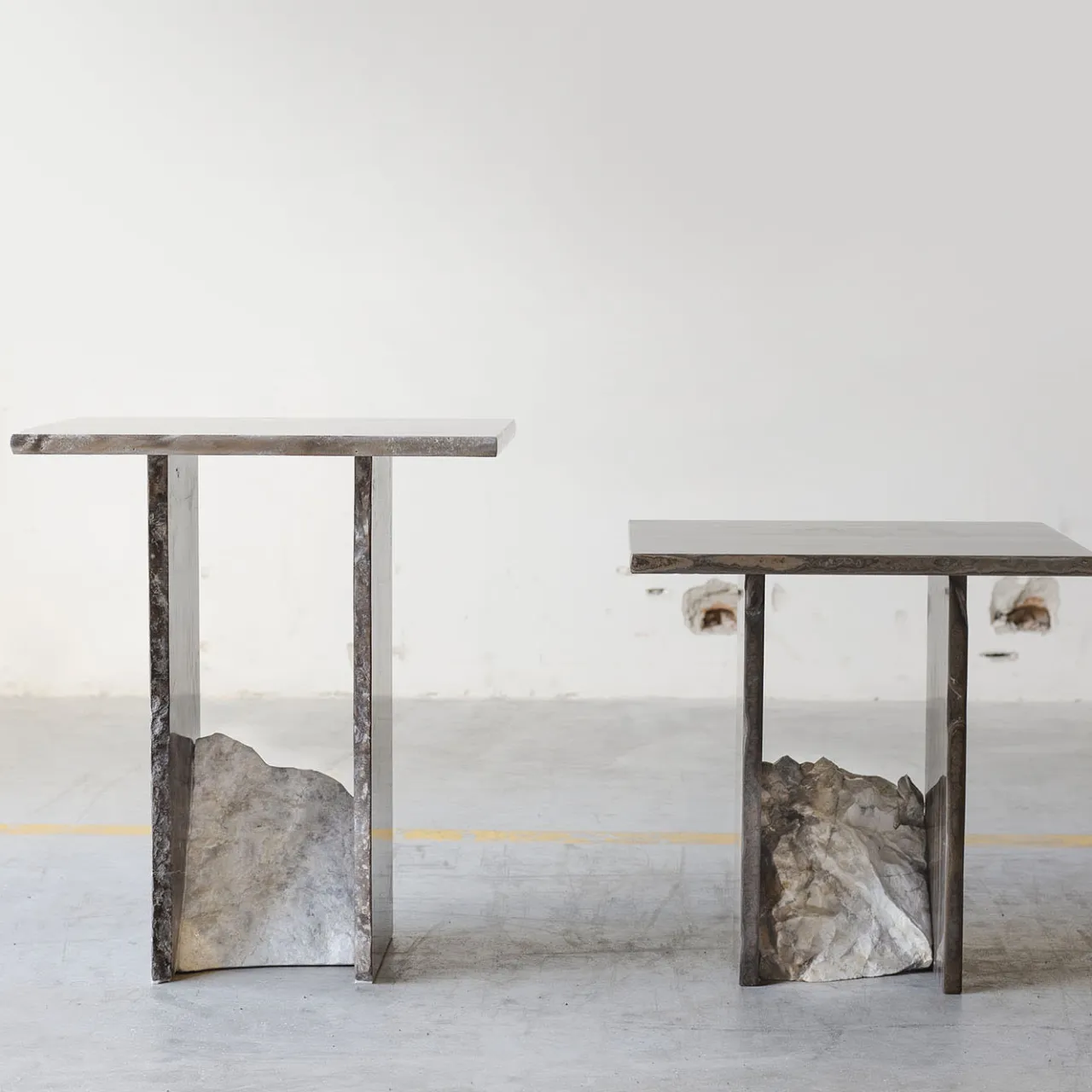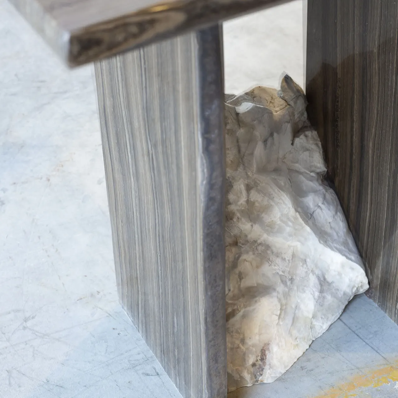Questo tavolino fa parte di un set di due pezzi. Combina linee eleganti e pietra di marmo scultorea, elegantemente accostata ai ritagli di marmo del piano e dei fianchi. Una scultura funzionale che gioca con la geometria, l’equilibrio e la natura per elevare il look di qualsiasi spazio abitativo contemporaneo. La struttura in marmo è composta da marmo Eramosa, mentre la base è di colore grigio invisibile.