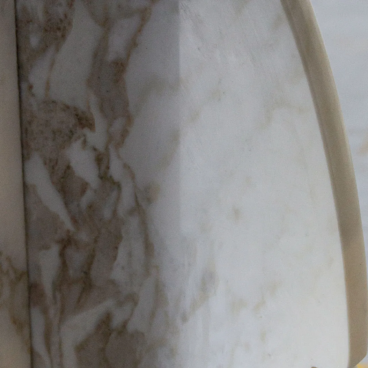 Il tavolino è composto da due ovali in marmo Calacatta Oro sostenuti da altri ritagli dello stesso marmo.