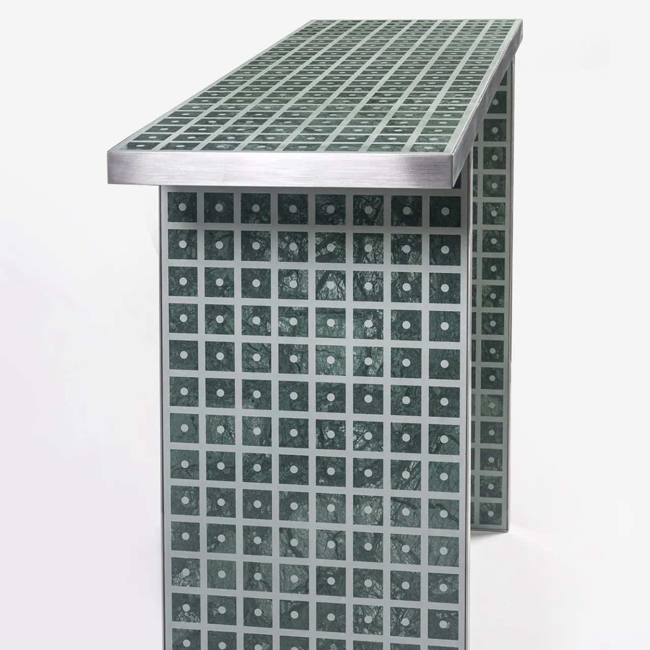 Parte della collezione Standard Geometries, disegnata da David/Nicolas pensando a motivi geometrici semplici e ripetitivi, questa consolle esalta il rigore ortogonale. L’acciaio spazzolato accentua i suoi profili minimalisti, mentre la combinazione di marmo verde del Guatemala e di cemento di colore verde conferisce unicità e vivacità cromatica all’ampio disegno dei quadrati. Per versioni personalizzate, consultare il Concierge.