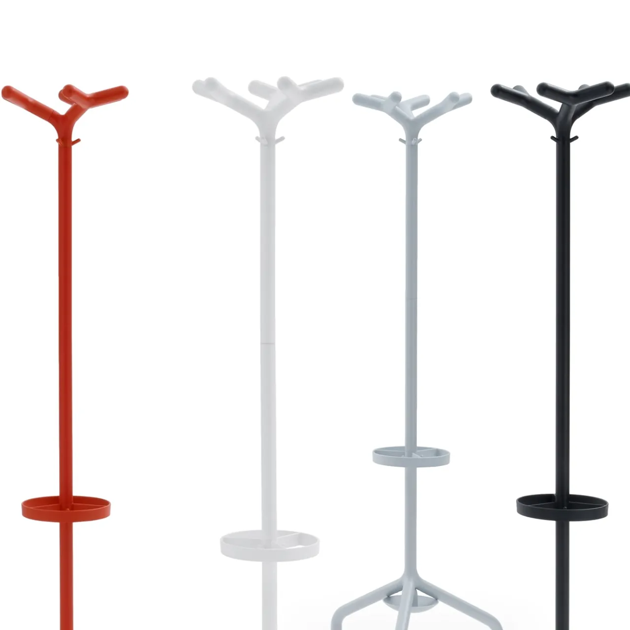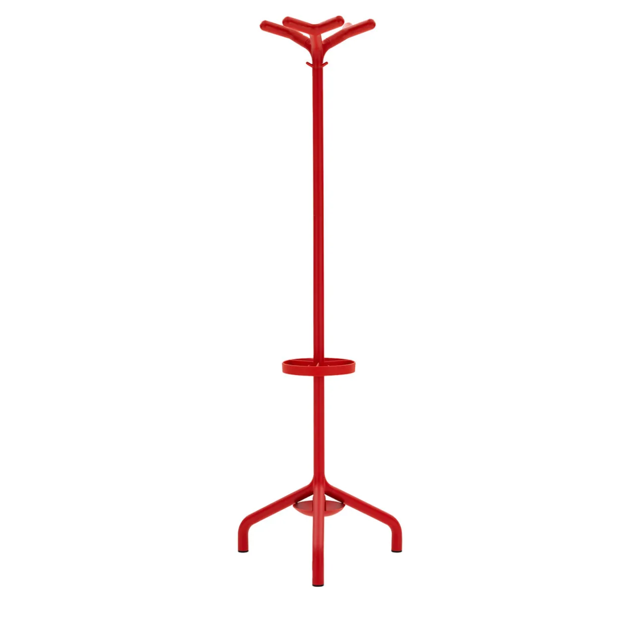 Stilo è un appendiabiti dal design vintage composto da una struttura a tre piedi in metallo verniciato e giunto in alluminio pressofuso. I nove ganci in plastica consentono di appendere facilmente borse e indumenti. Un anello e un vassoio in plastica possono essere montati sul telaio per ottenere un comodo portaombrelli. Appendiabiti a piantana con portaombrelli in tubolare d’acciaio diam. 35 cm, finitura rossa