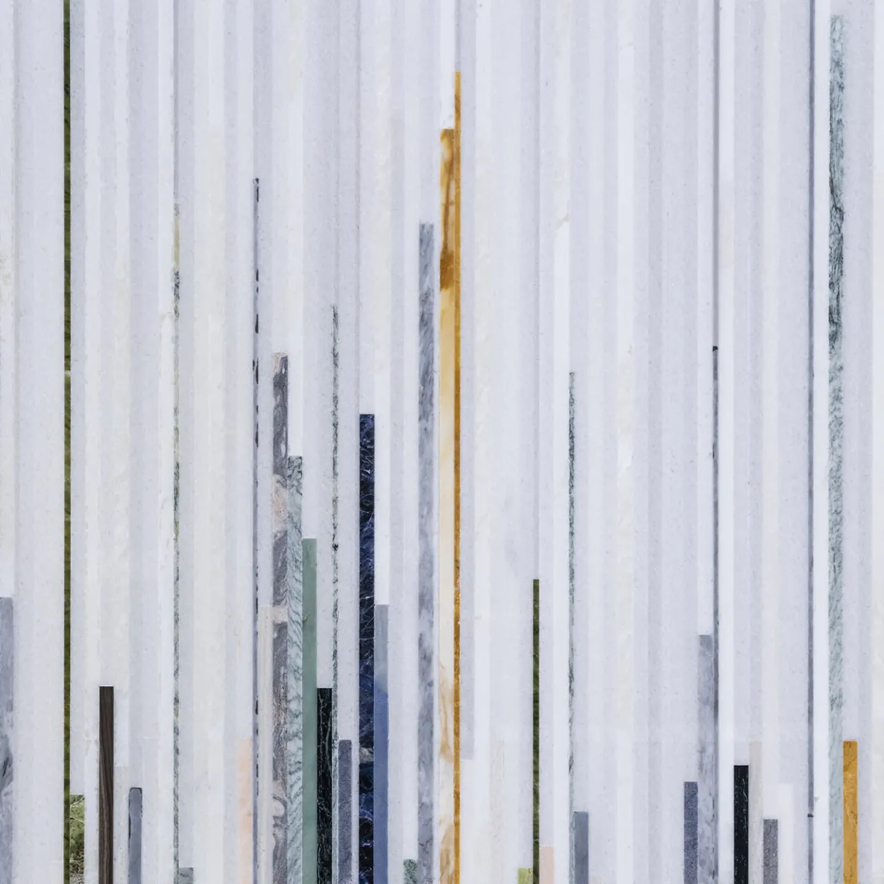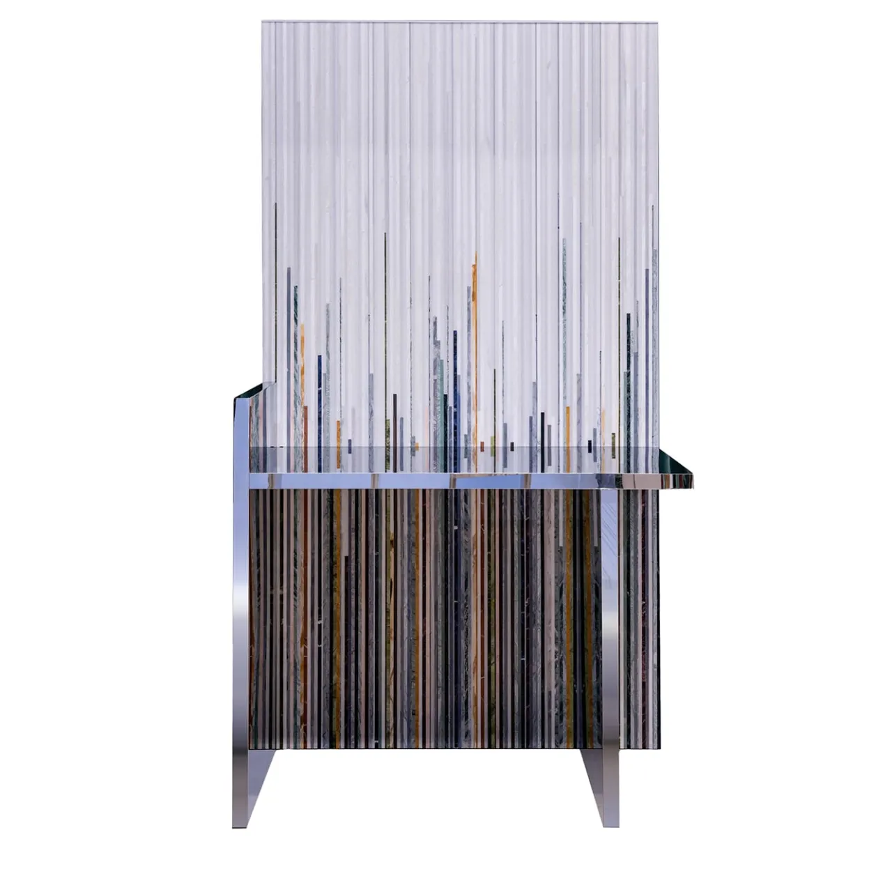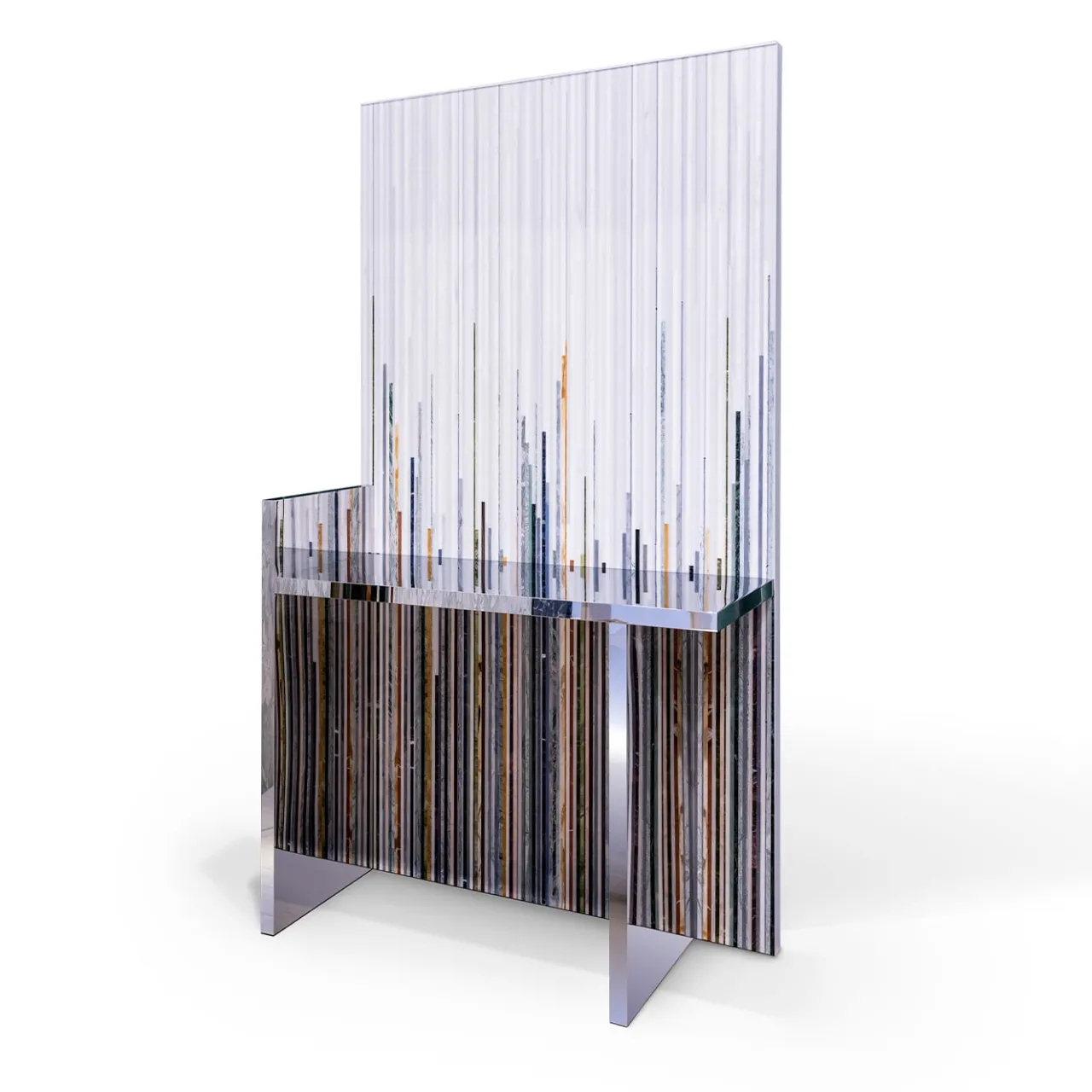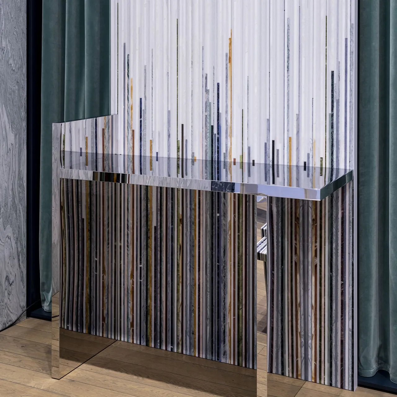 La Consolle Subarashi, dell’esclusiva Fragment Collection di Gwenael Nicolas per Budri – presentata alla Milano Design Week 2022, dal forte impatto scenico, è unica nel suo genere: è composta da un rivestimento autoportante in tondini di marmo policromi. Come un tessuto, la superficie verticale sfuma da marmi bianchi a una caduta libera di strisce di colore nella parte inferiore. Il motivo realizzato con materiali preziosi, tra cui la Sodalite, si riflette sulla consolle a specchio.