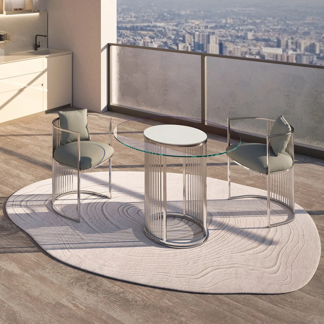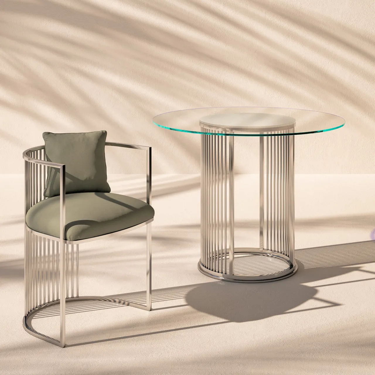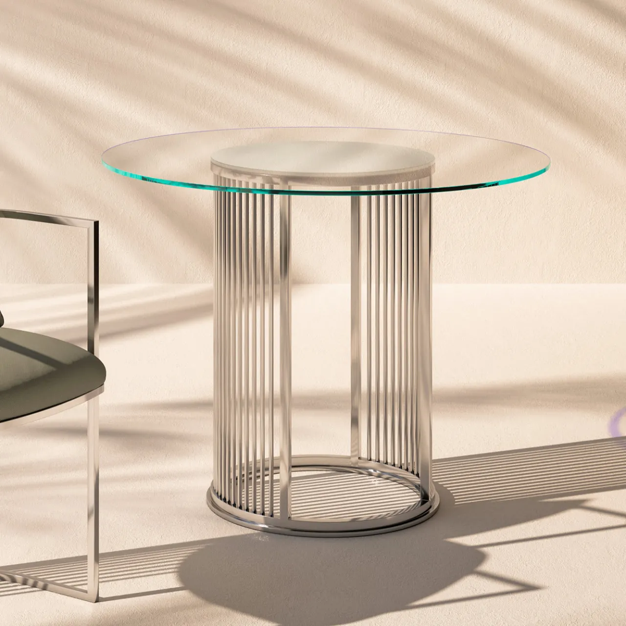 Linee geometriche e materiali riflettenti sono elegantemente combinati in questo splendido tavolo rotondo. Soluzione di classe per fare colazione o cenare all’aperto, è composto da un piano circolare in vetro extrachiaro retroverniciato al centro e appoggiato su una scintillante colonna in acciaio inox caratterizzata da un arioso motivo traforato di aste verticali, che si estendono da una base ad anello.