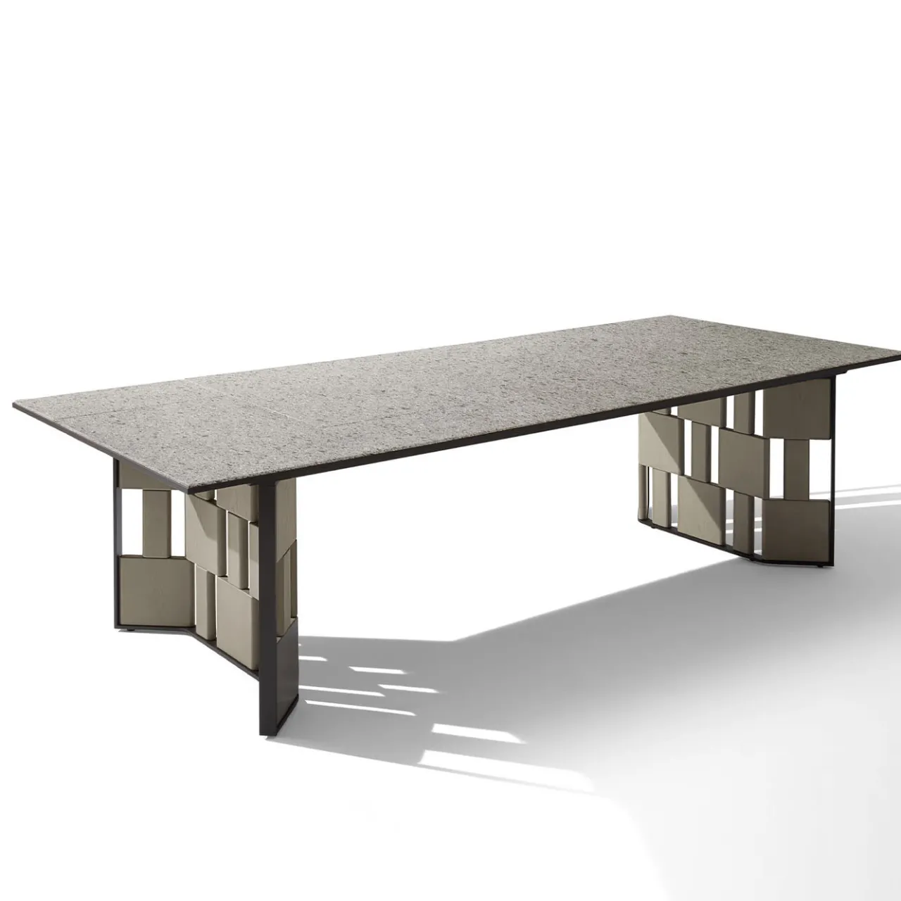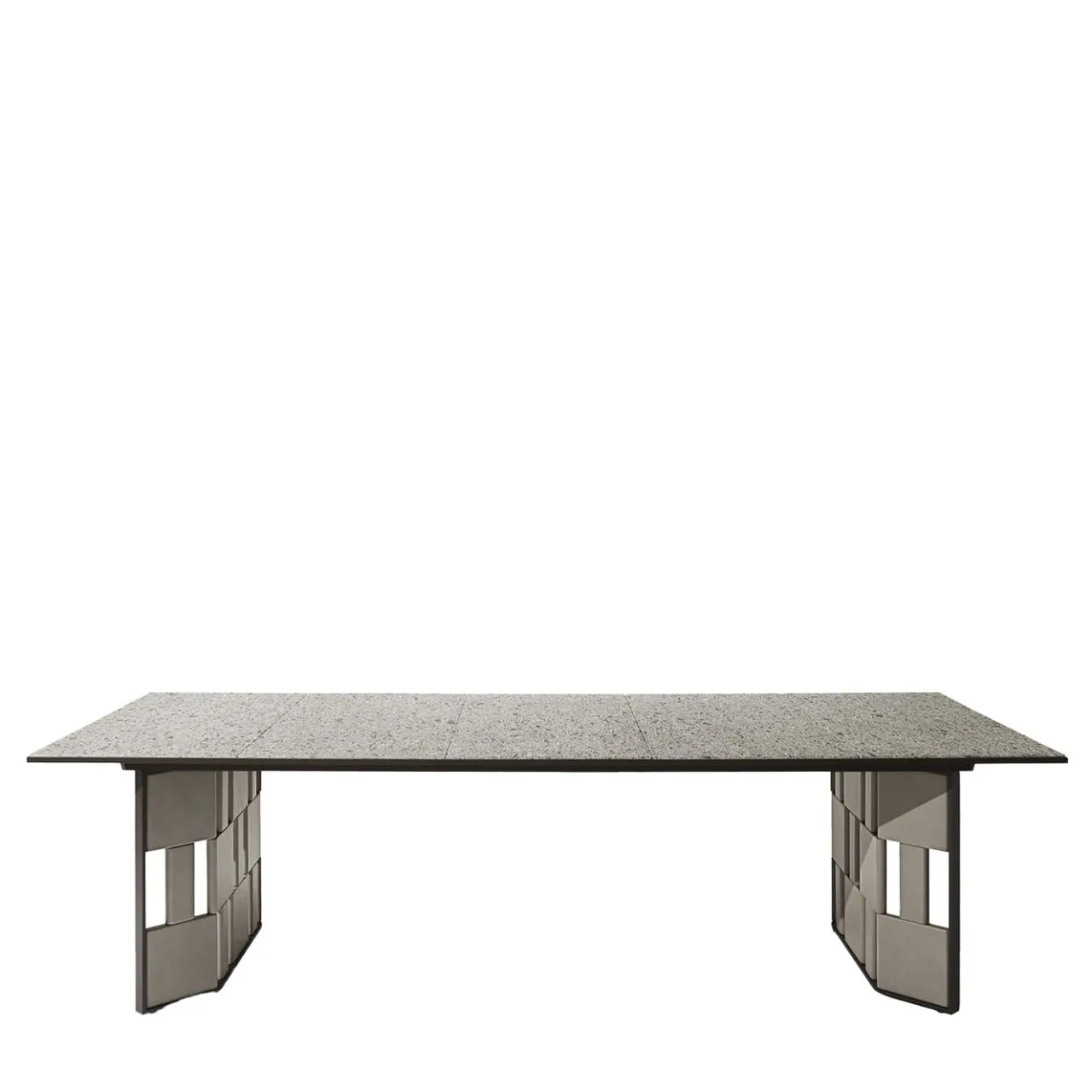 Questo bellissimo tavolo rettangolare è realizzato in alluminio e acciaio inox protetto, verniciato a polvere nel colore carruba, gambe in legno di frassino e piano con inserti in pietra lavica dell’Etna.