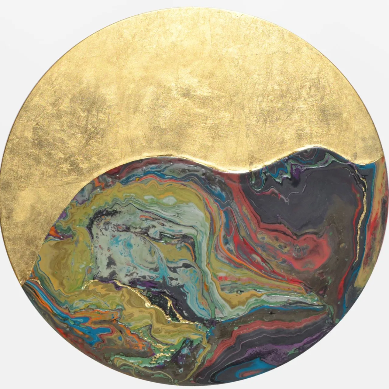 Caratterizzato da curve armoniose, questo tavolino rotondo è un complemento prezioso per interni in stile classico o industriale. La lucentezza è dovuta all’abile applicazione della foglia d’oro che, interagendo con un colorato aspetto ossidato, conferisce al pezzo il suo fascino artistico. Accuratamente decorato a mano e sostenuto da un disco in Fenix, il piano poggia su una dinamica base a tromba in metallo decorata con ceramica.