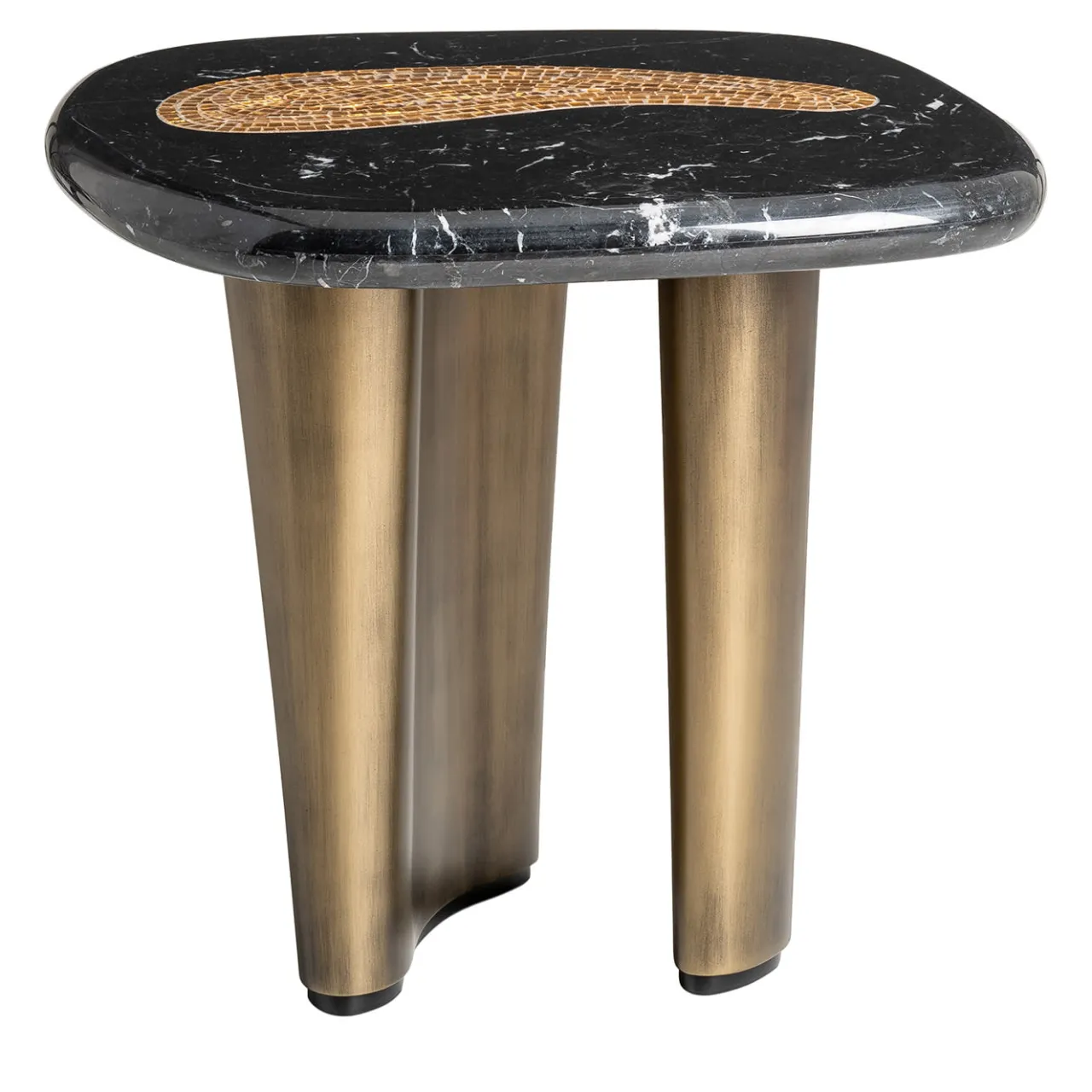Questo elegante tavolino è caratterizzato da gambe in multistrato di bronzo antico opaco e da un elegante piano in marmo nero lucido Marquina, ornato da intricati inserti in mosaico dorato che aggiungono luminosità e un raffinato tocco artistico. Le gambe, con la loro finitura in bronzo antico, emanano un’eleganza e una stabilità senza tempo, rendendolo perfetto sia per gli spazi moderni che per quelli classici.