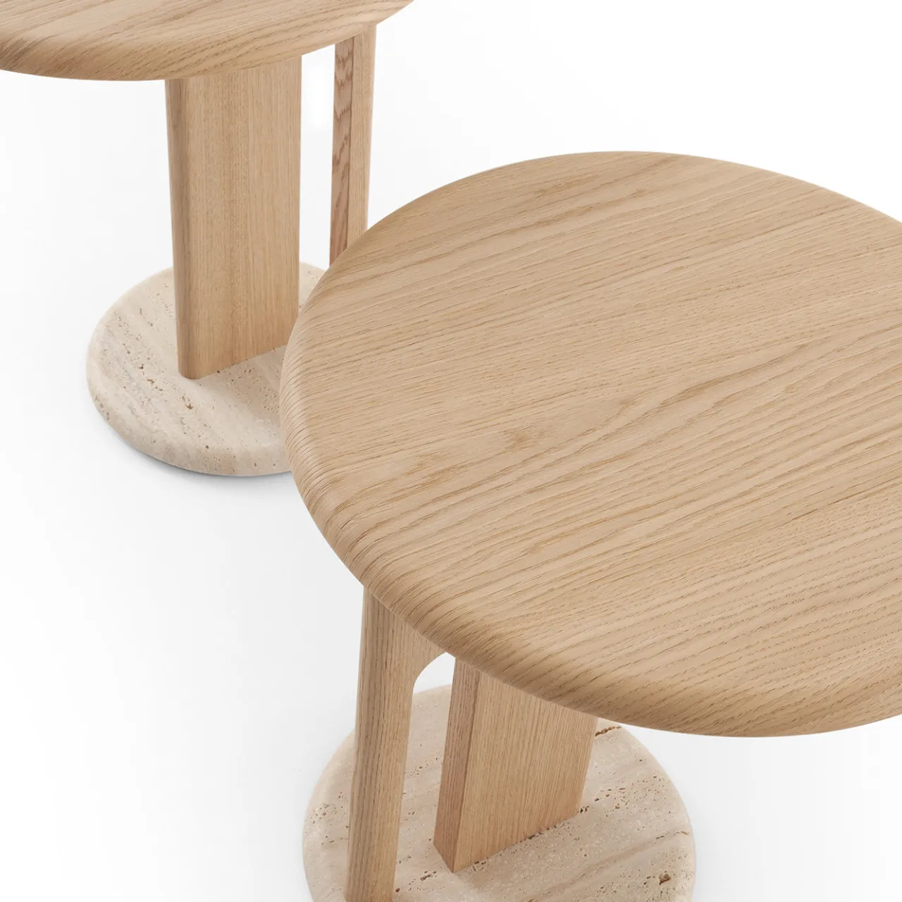 Questo tavolino presenta un piano in impiallacciatura di rovere naturale con una finitura a membrana. La struttura in rovere tornito supporta il piano del tavolo, mentre la base è realizzata in marmo travertino romano a poro aperto, combinando calore e solidità in un design equilibrato.
