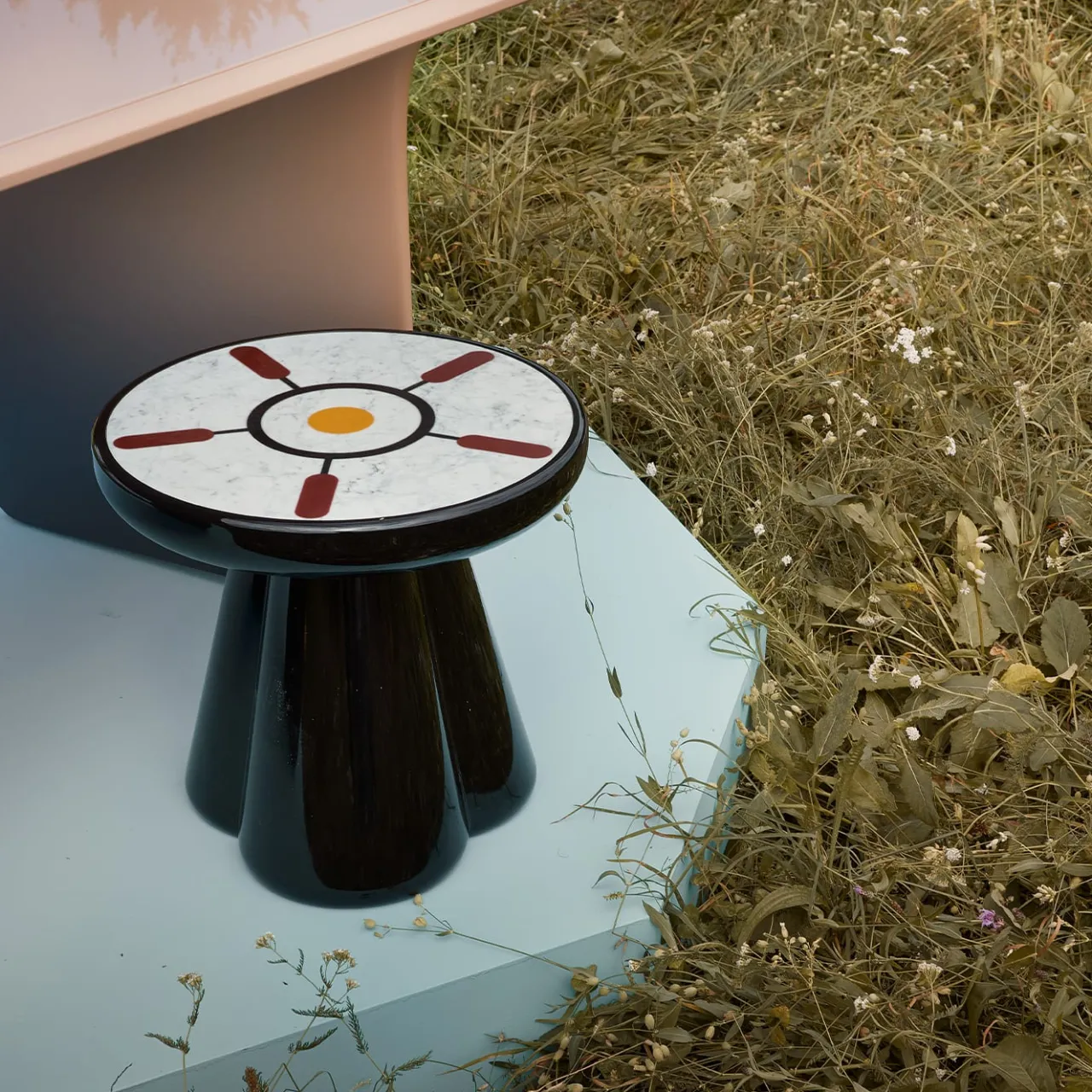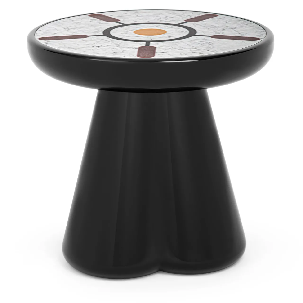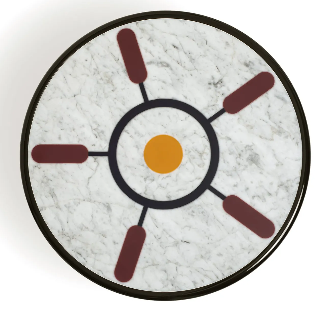 Cerchi, linee e orbite in resina si fondono su un piano di marmo spesso. Un’ampia base divisa in tre dà stabilità al tavolino e ne rende unico il design.