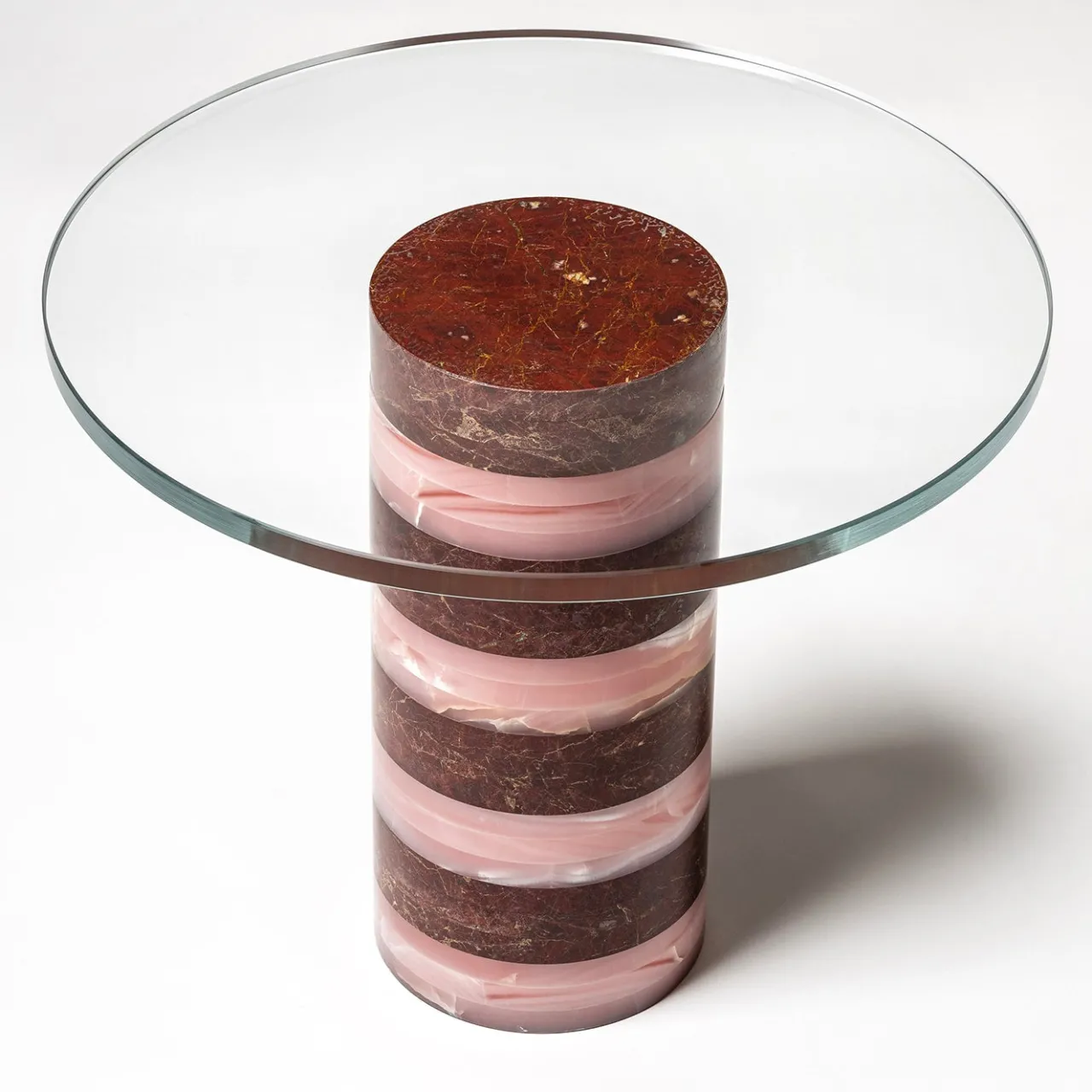 Tavolino Architexture in Onice Rosa Aquarel e Marmo Rosso Barocco. Gli allegri Side Table della collezione Architexture, con piano circolare in vetro extrachiaro e gambe a colonna, sono caratterizzati da sfumature di colori vivaci. Versatili e facilmente abbinabili alle altre forme della stessa collezione, diventano protagonisti assoluti dello spazio.