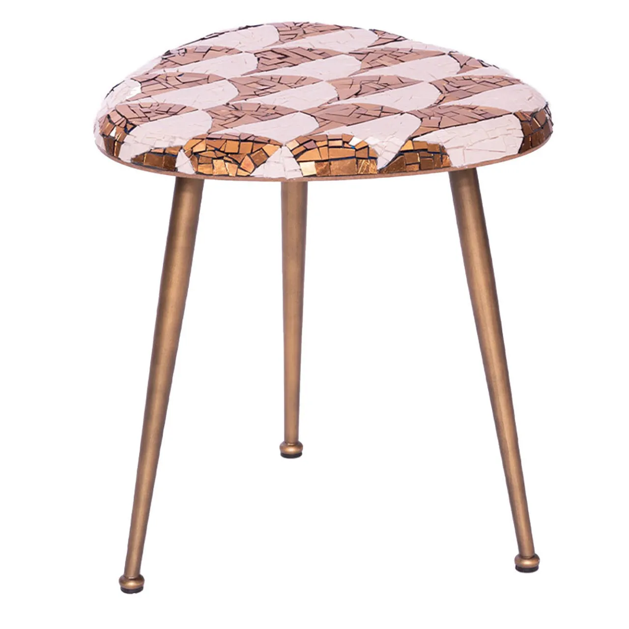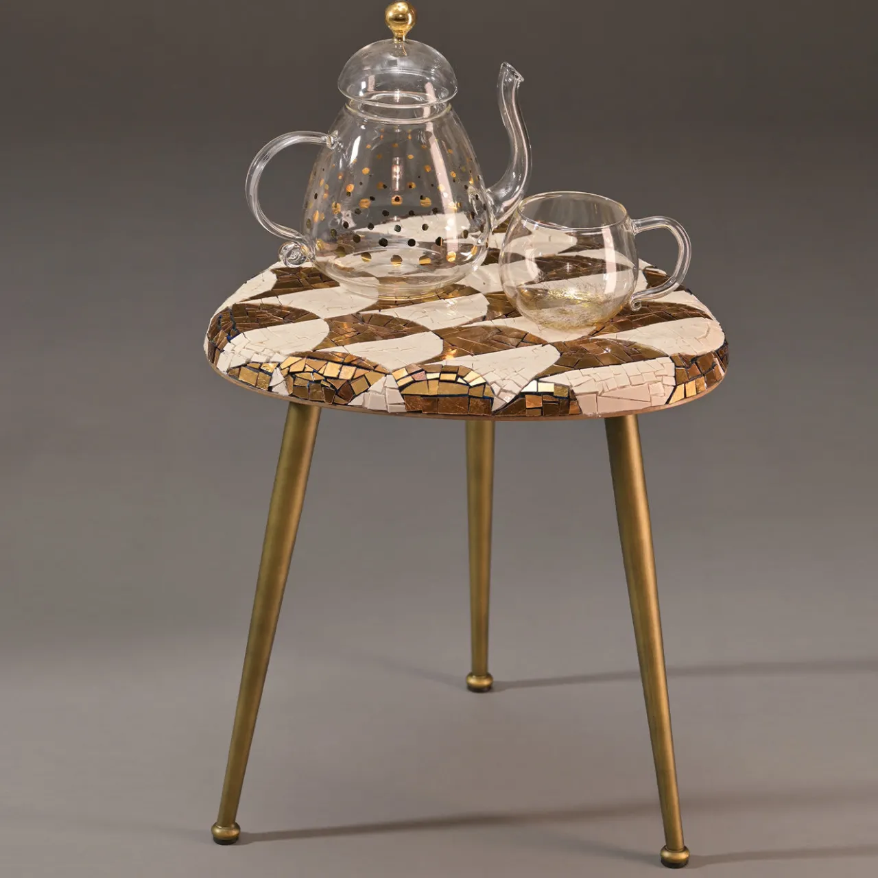 Parte di una serie della rinomata designer Michela Nardin, Palmira è un tavolino unico che combina elementi creati dall’eccellenza artigianale italiana. Il piano triangolare in legno, realizzato da artigiani vicentini, è interamente ricoperto da un superbo mosaico composto da 1100 “spizzi” (tessere di vetro di forma irregolare tagliate a mano) realizzati a Venezia da Orsoni, alcuni bianchi e altri arricchiti con foglia d’oro 24 carati.