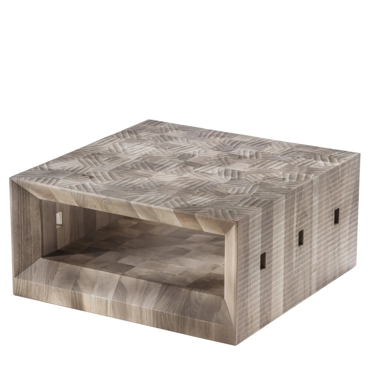 Sublime vetrina della tradizione artigianale, questo splendido tavolino celebra il legno nella sua essenza più pura. Ricavato da un unico pezzo di noce italiano e rifinito a mano in rilievo con una sgorbia, i lati, l’interno e il piano presentano diversi motivi decorativi in un armonioso gioco di forme geometriche e sinuose.