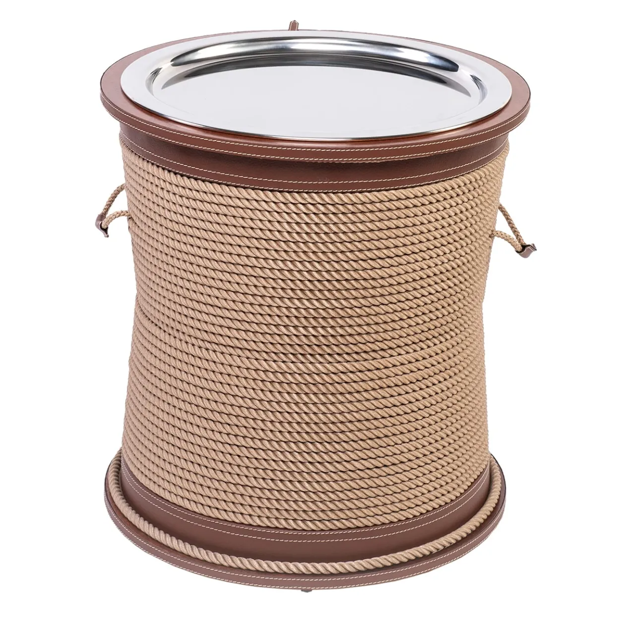 Questo design esclusivo, ricco di dettagli sartoriali di lusso e di un’atmosfera nautica, farà da elegante sfondo agli aperitivi da gustare nelle aree del pozzetto. Progettato per massimizzare la funzionalità in una forma compatta, il pezzo presenta una silhouette in legno a forma di tamburo rivestita in pelle beige e ampiamente ricoperta da file di corde nautiche, utilizzate anche per le pratiche maniglie laterali. Il vassoio rotondo in acciaio può essere sollevato per riporre bottiglie e bicchieri.